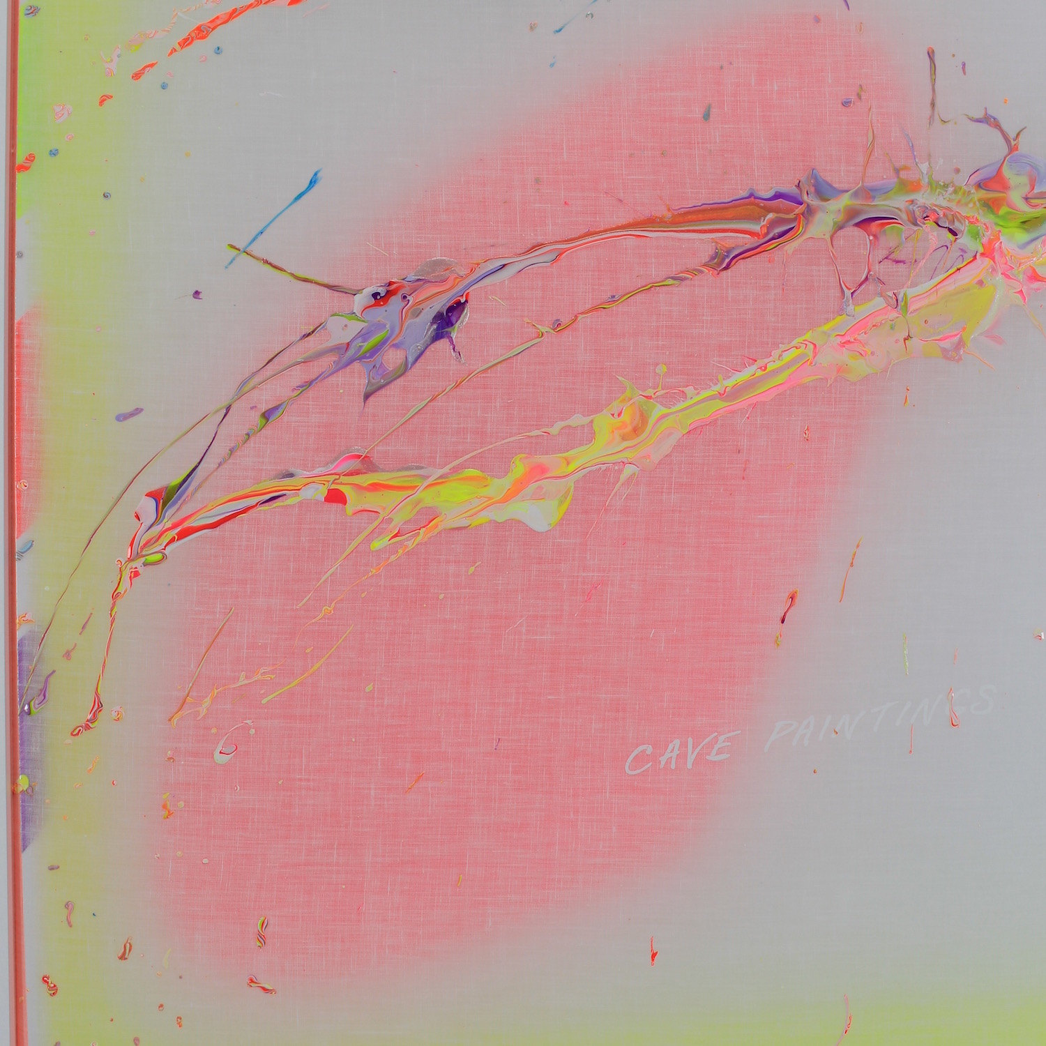 “CAVE PAINTINGS" (white lettering). "REAL ART FAKE ART REAL ART FAKE ART......" (written repetitively in small black lettering diffused along the top and bottom edges).