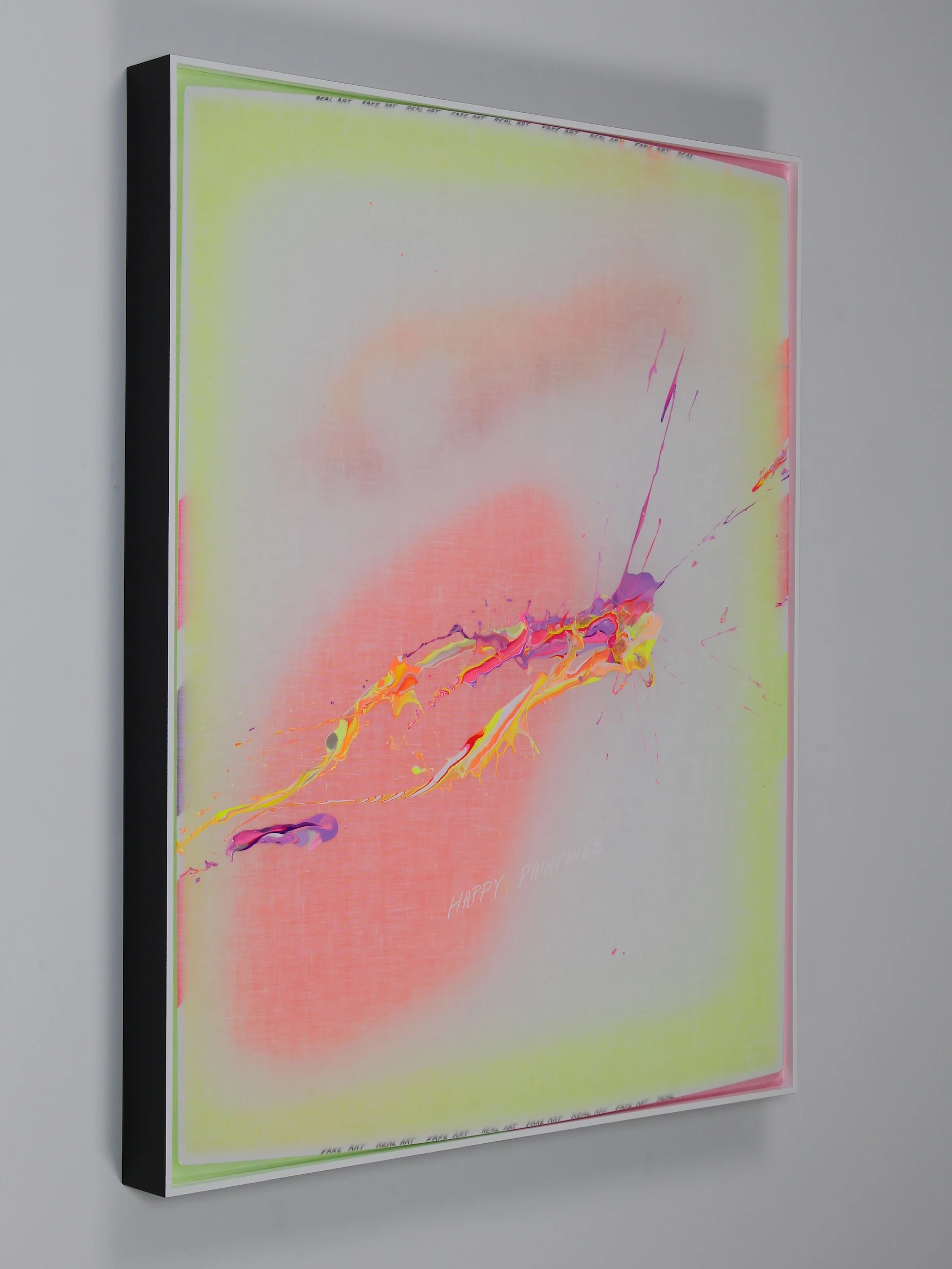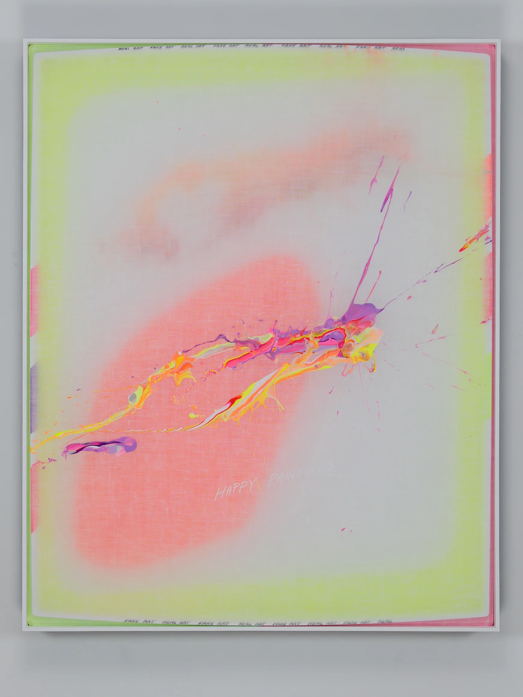 "HAPPY PAINTINGS" (white lettering). "REAL ART FAKE ART REAL ART FAKE ART......" (written repetitively in small black lettering diffused along the top and bottom edges).
