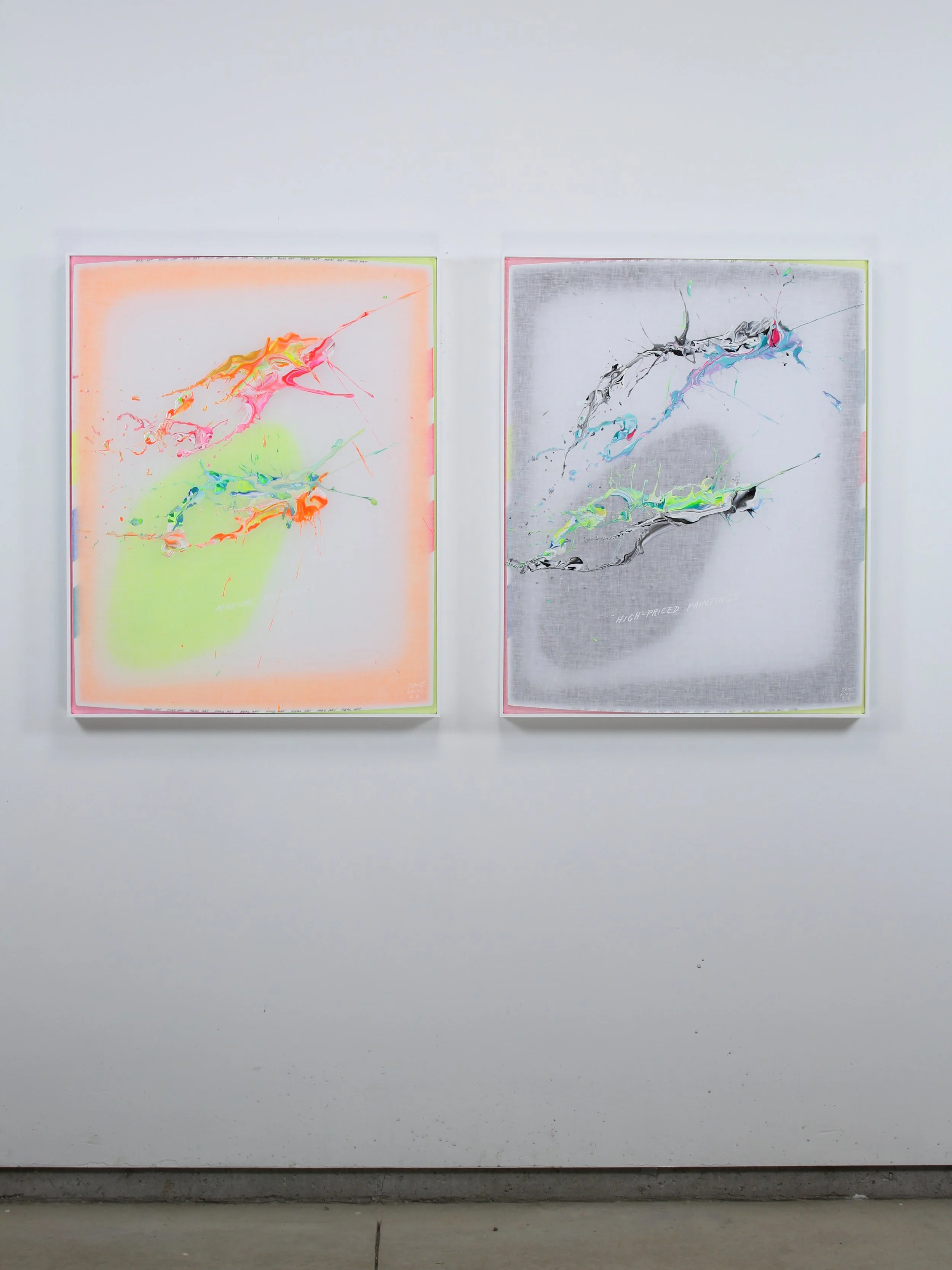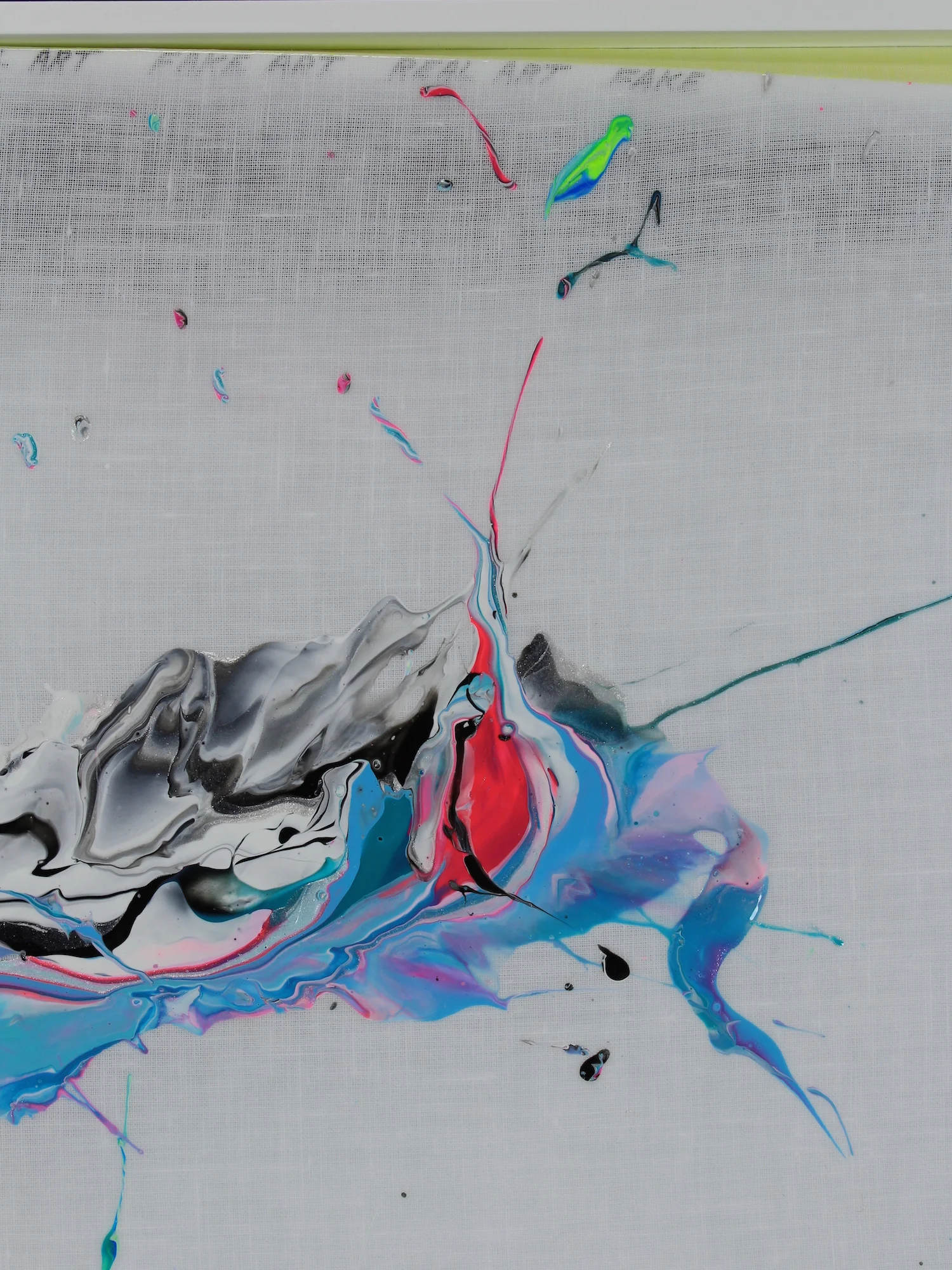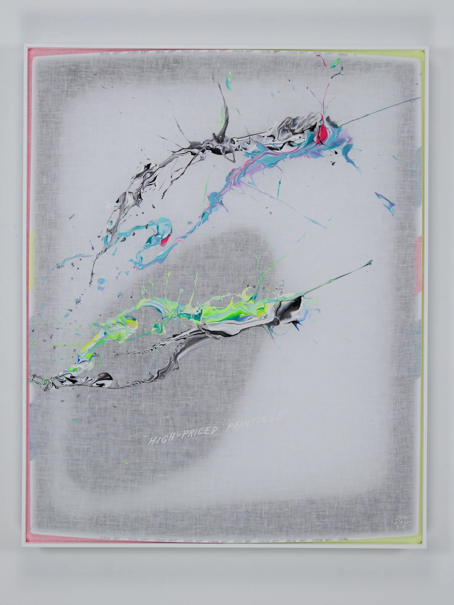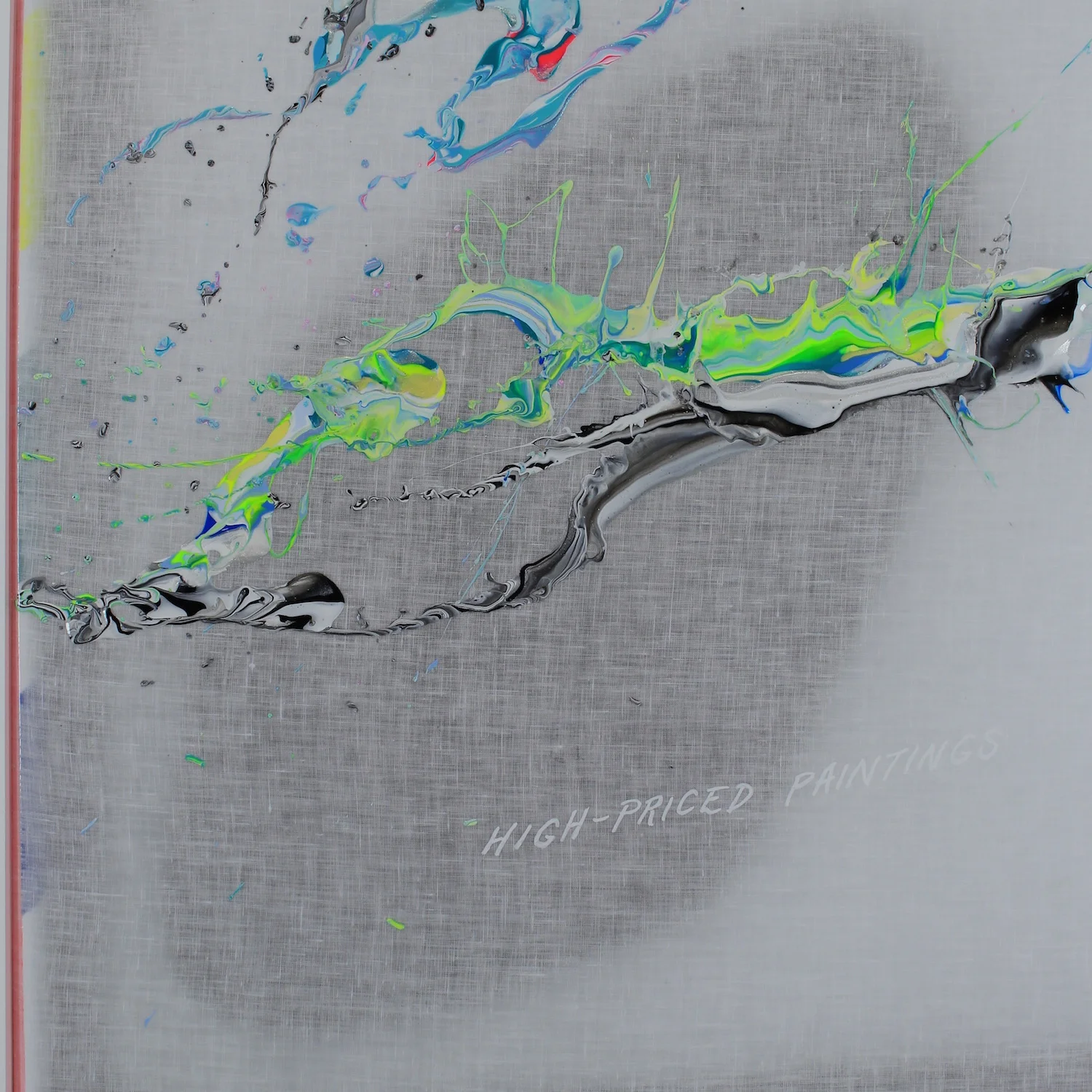 "HIGH-PRICED PAINTINGS" (white lettering). "REAL ART FAKE ART REAL ART FAKE ART......" (written repetitively in small black lettering diffused along the top and bottom edges).