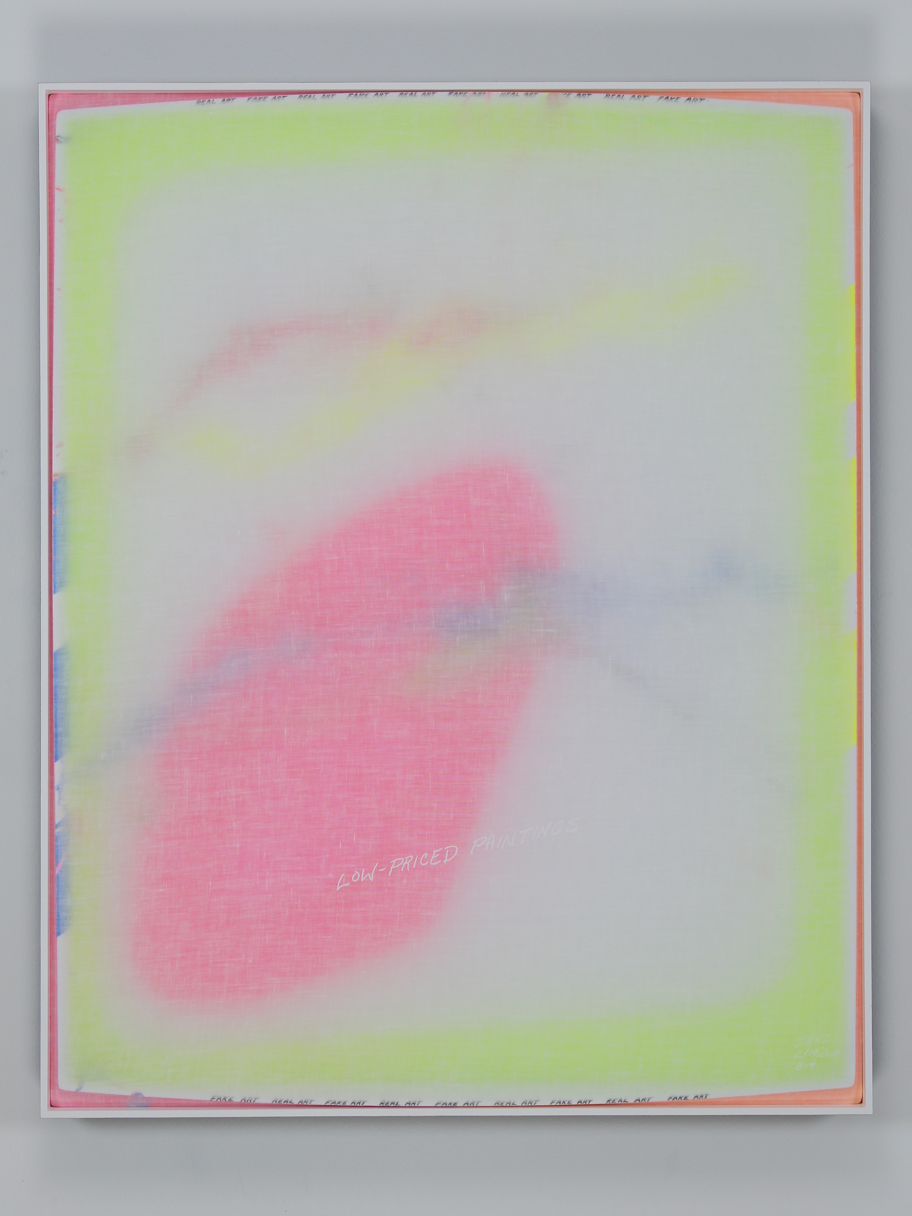 "LOW-PRICED PAINTINGS" (white lettering). "REAL ART FAKE ART REAL ART FAKE ART......" (written repetitively in small black lettering diffused along the top and bottom edges).
