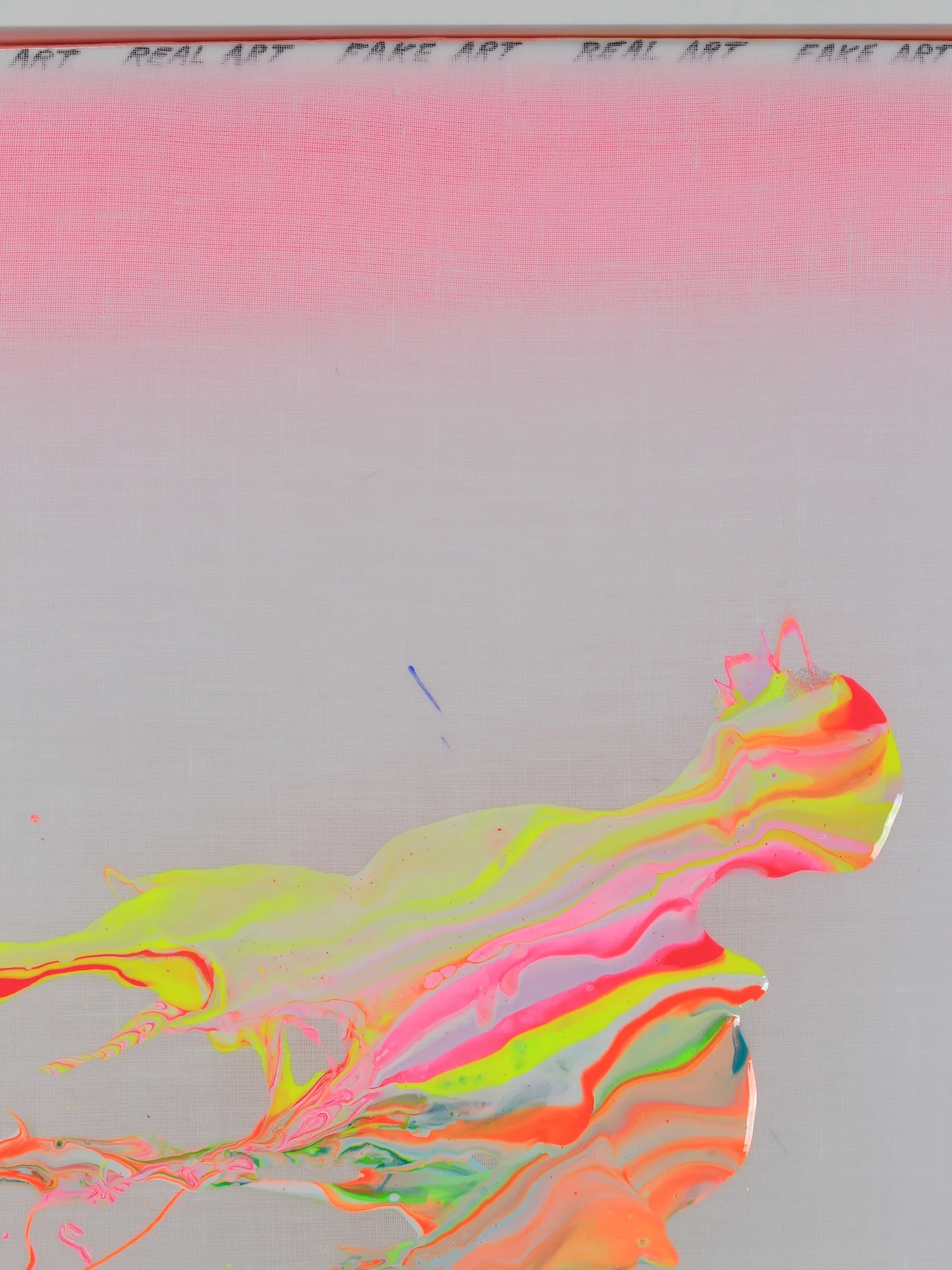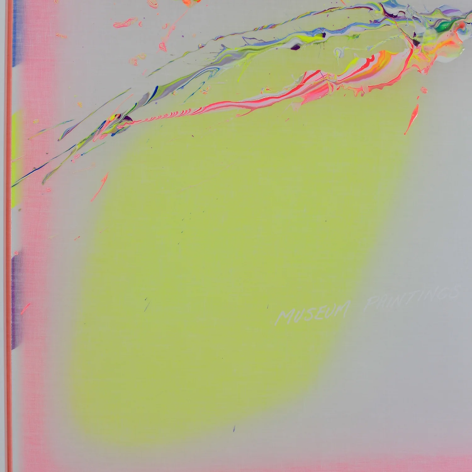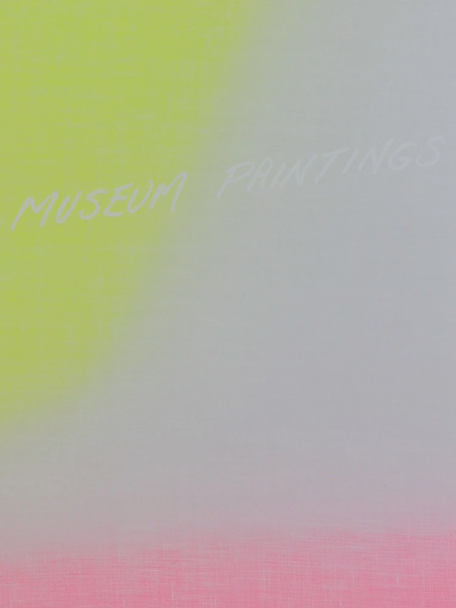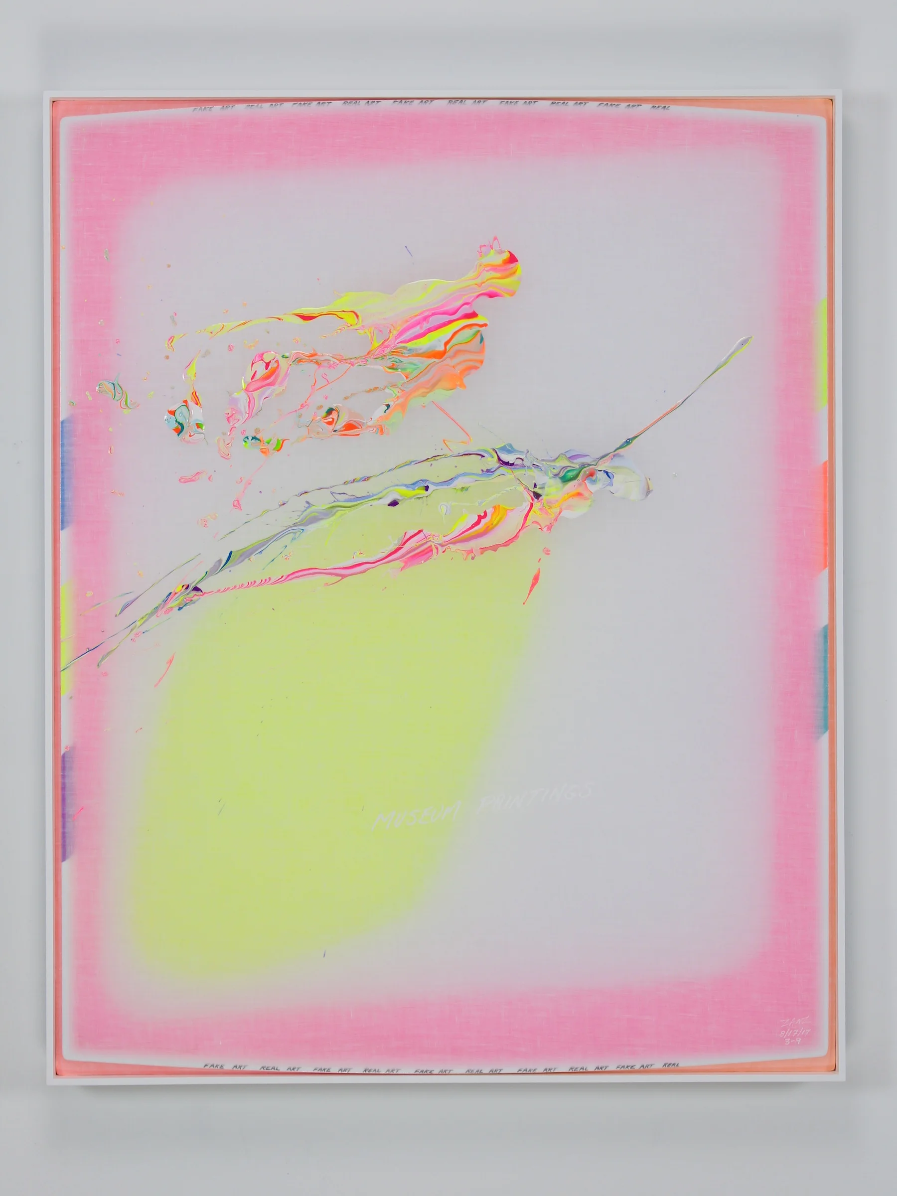 "MUSEUM PAINTINGS" (white lettering). "REAL ART FAKE ART REAL ART FAKE ART......" (written repetitively in small black lettering diffused along the top and bottom edges).