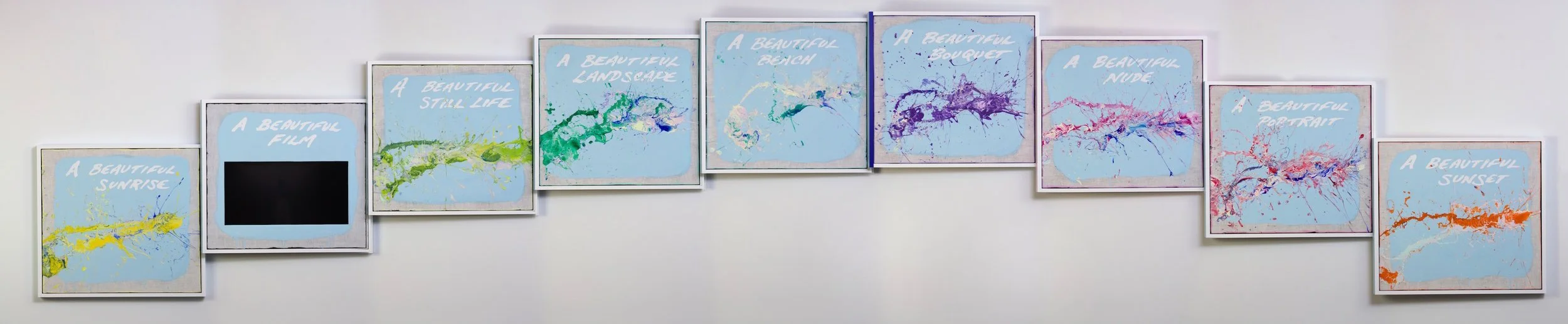 Beautiful-9 is a single installation painting composed of nine square works. Each painting names a familiar subject — sunrise, still life, landscape, beach, bouquet, portrait, nude, film, sunset. The words function as prompts rather than descriptions, opening a space for the viewer to form their own internal image.