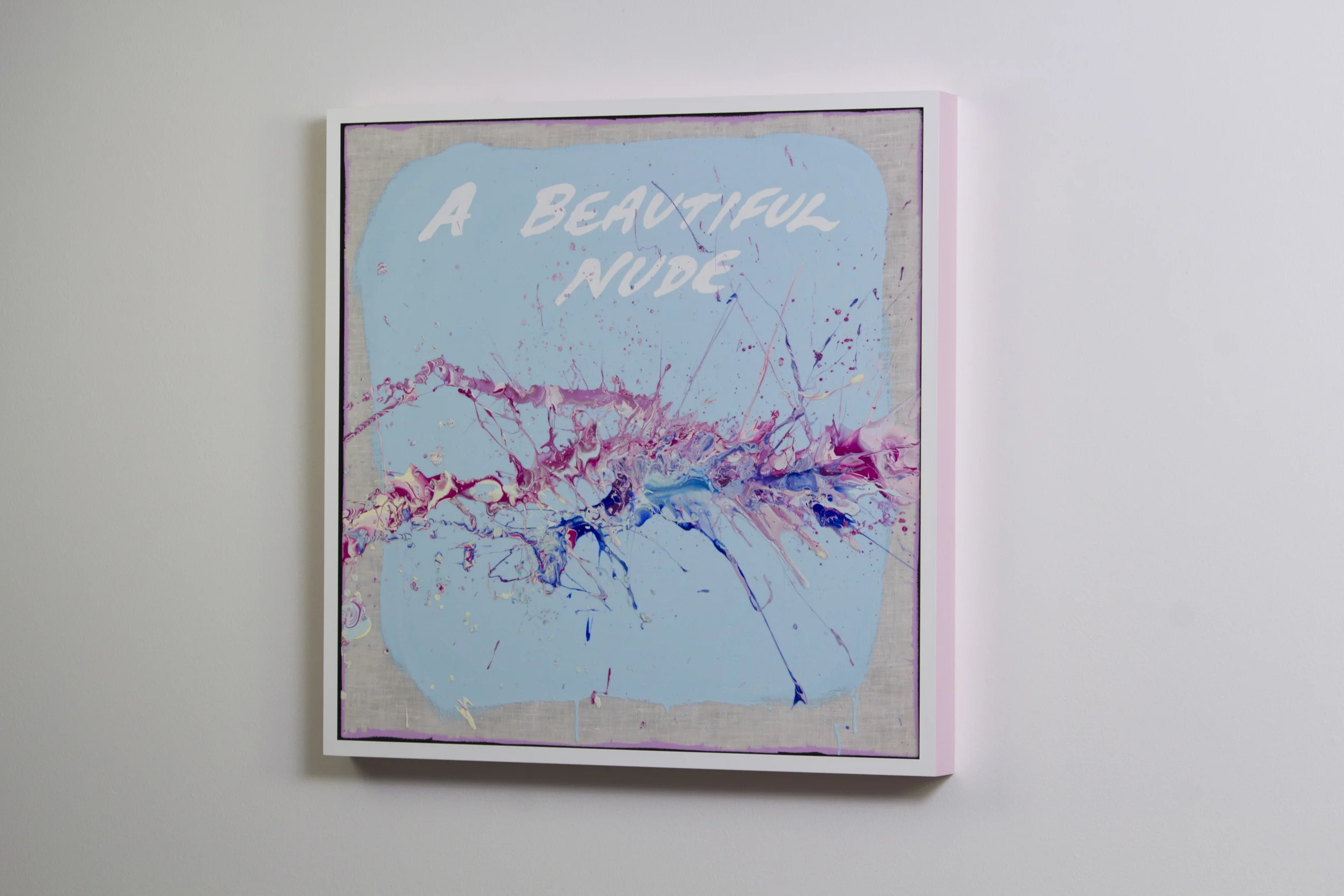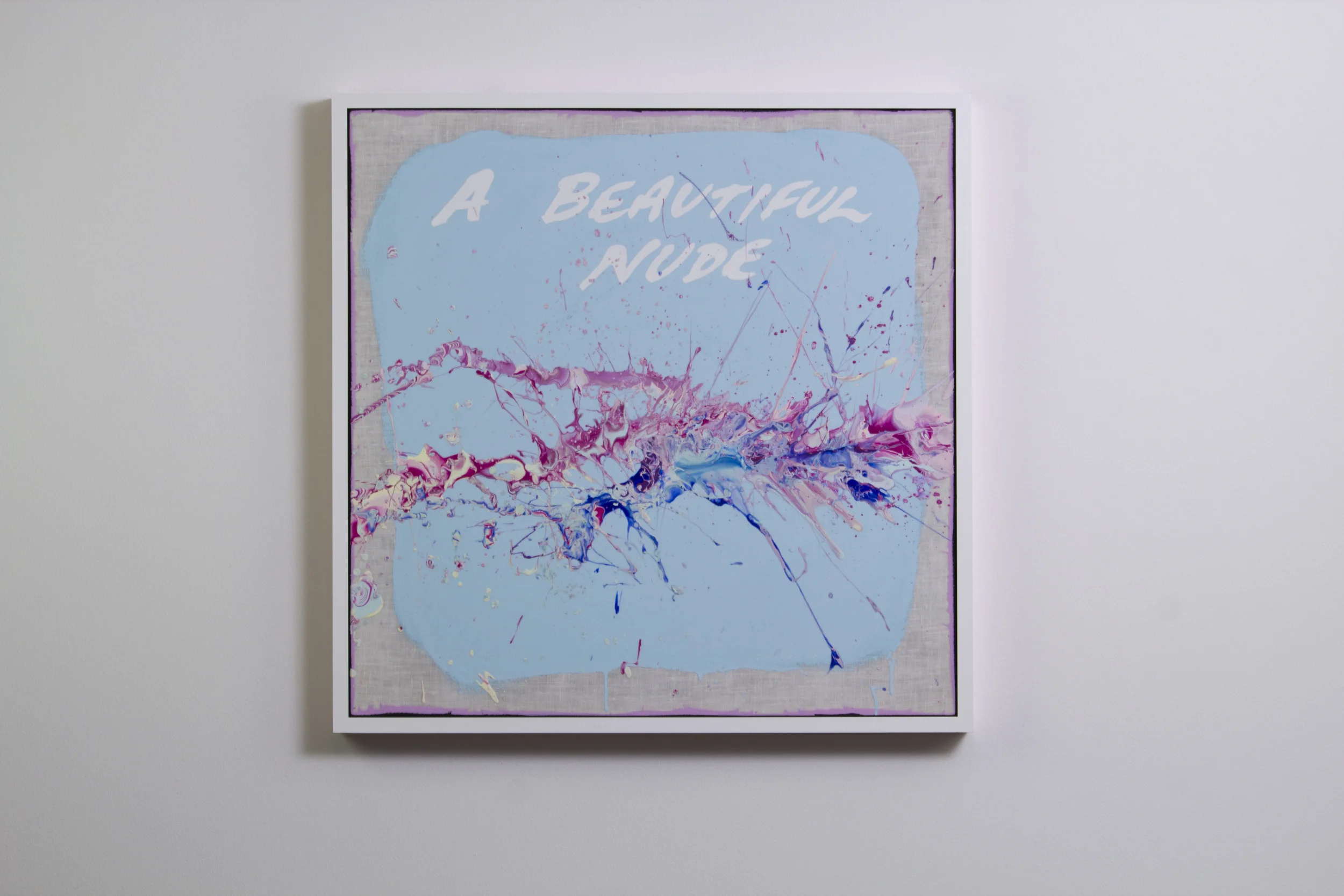 Acrylic and oil on white linen mounted over a handmade wood stretcher, framed.