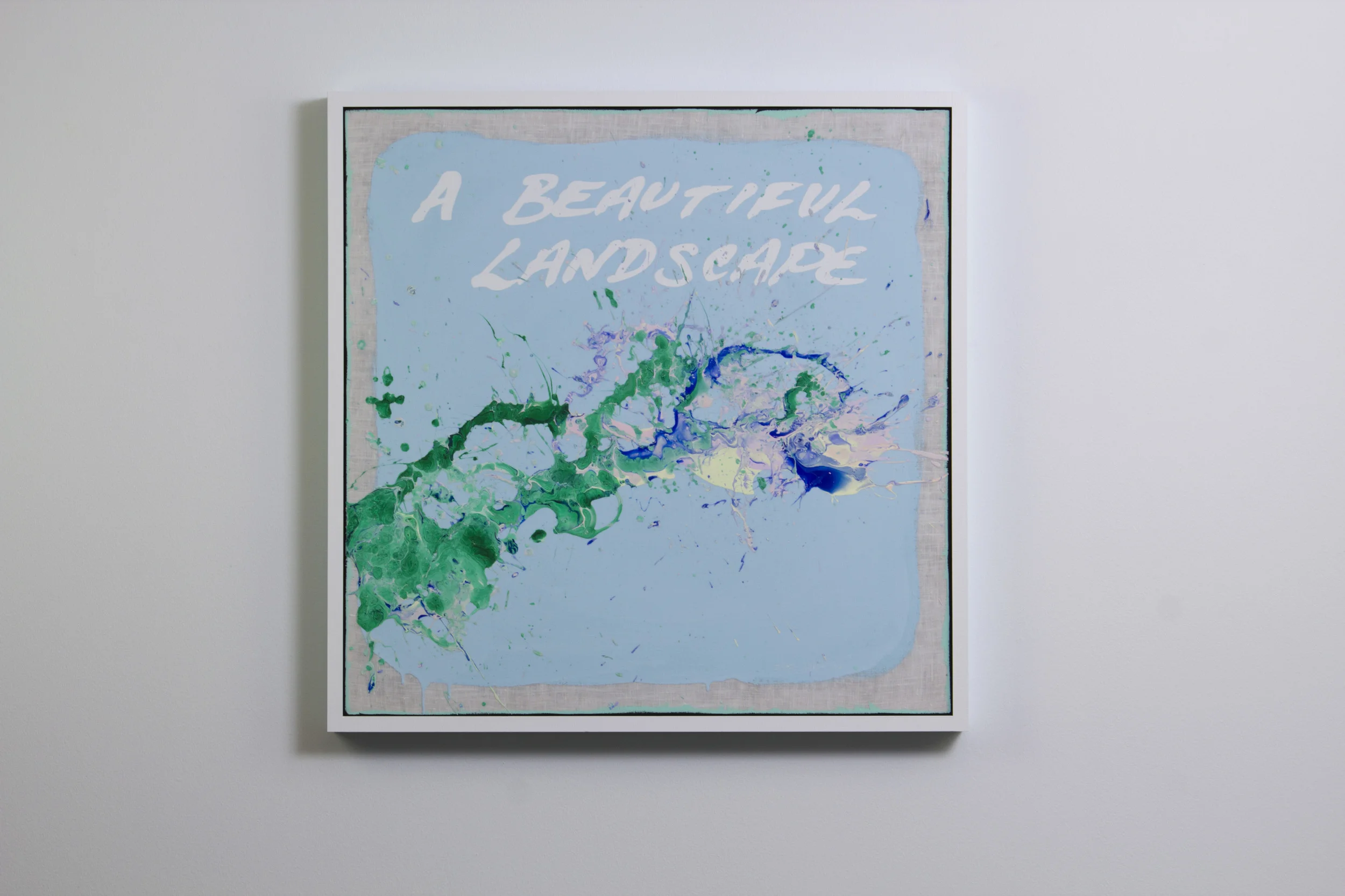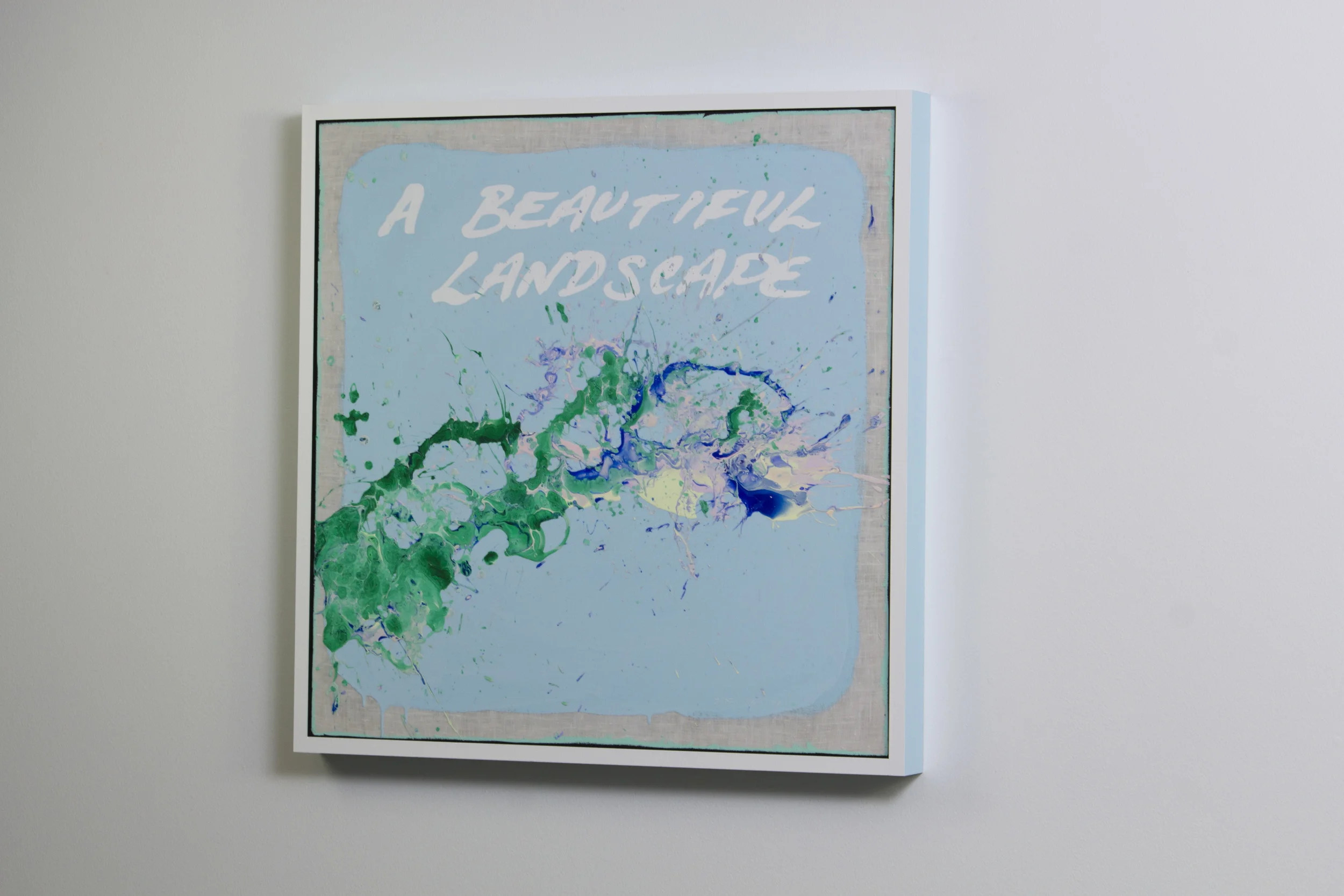 Acrylic and oil on white linen mounted over a handmade wood stretcher, framed.