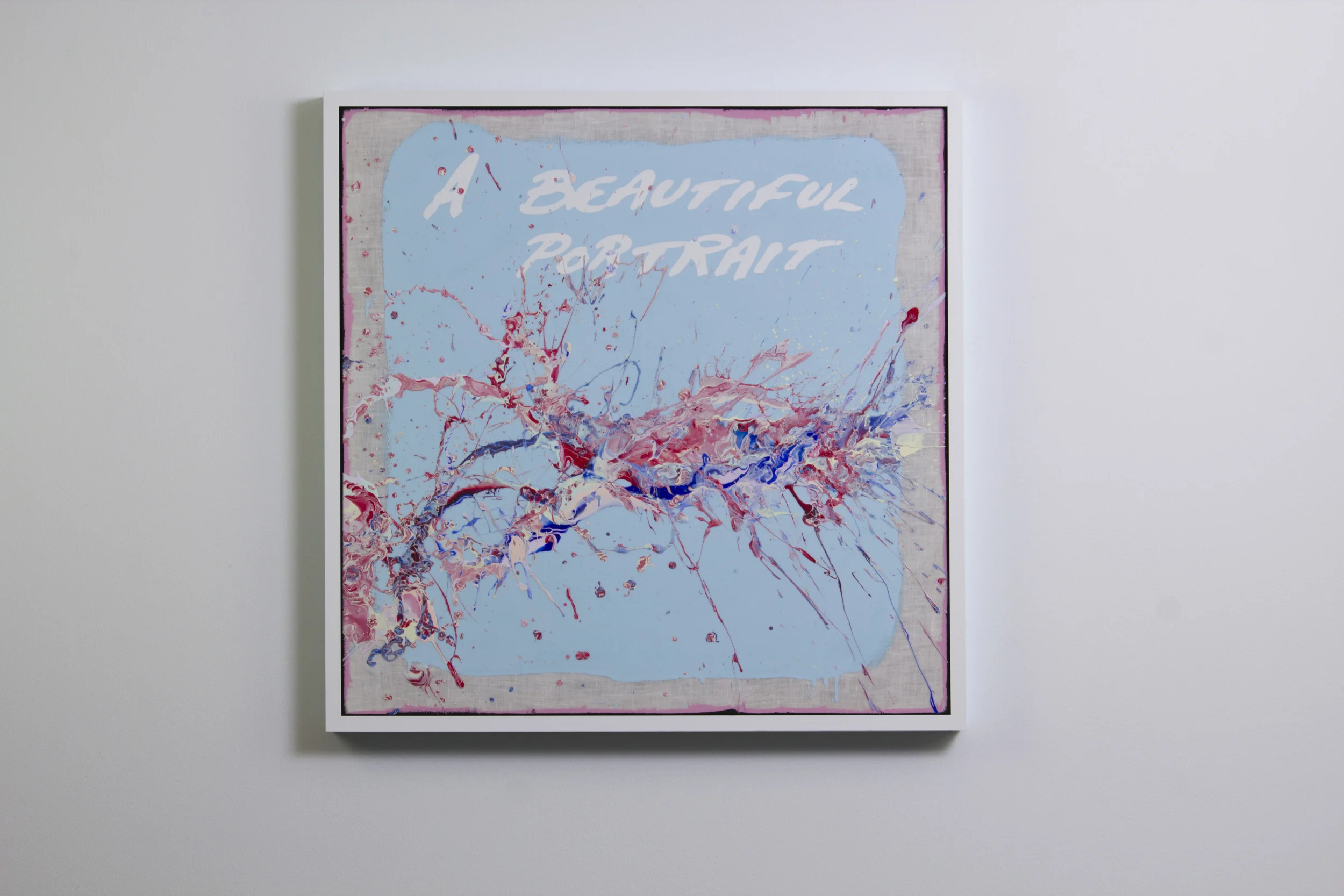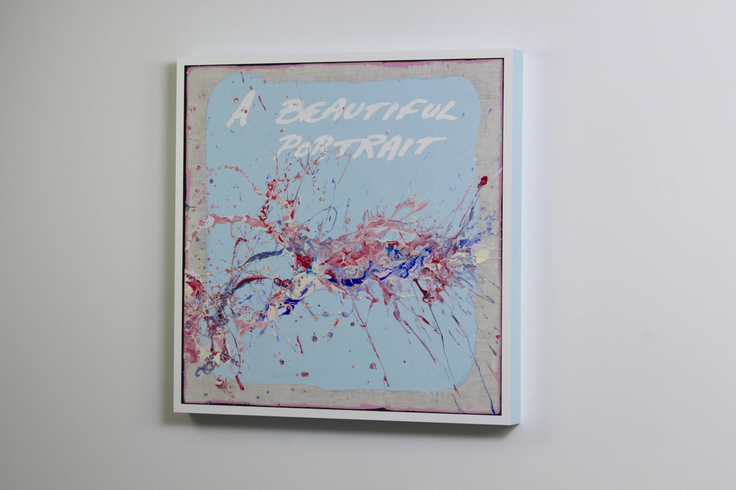 Acrylic and oil on white linen mounted over a handmade wood stretcher, framed.