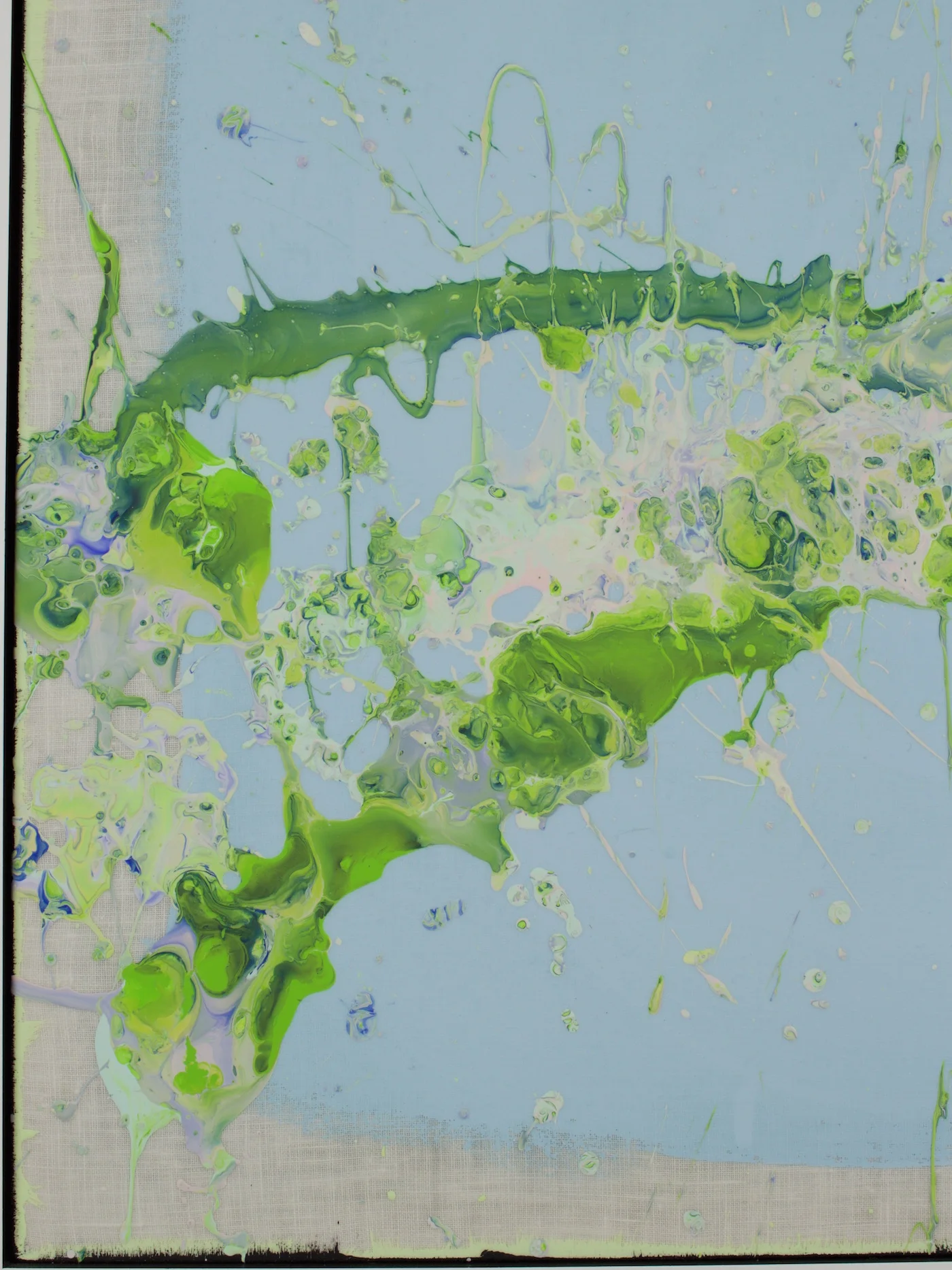 Acrylic and oil on white linen mounted over a handmade wood stretcher, framed.