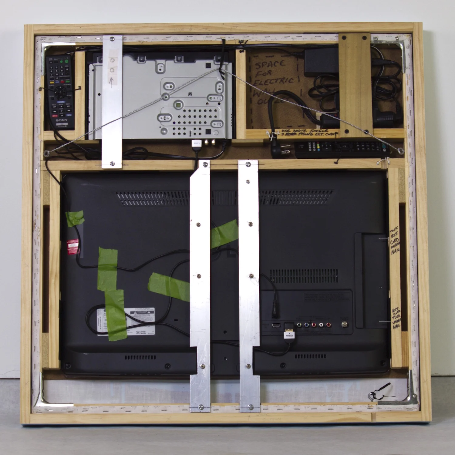 LG-26" LED HDTV, Sony blu-ray DVD player, surge protector, HDMI cable, TV & DVD remote controls, aluminum bars, wood, hanging wire, various fasteners.