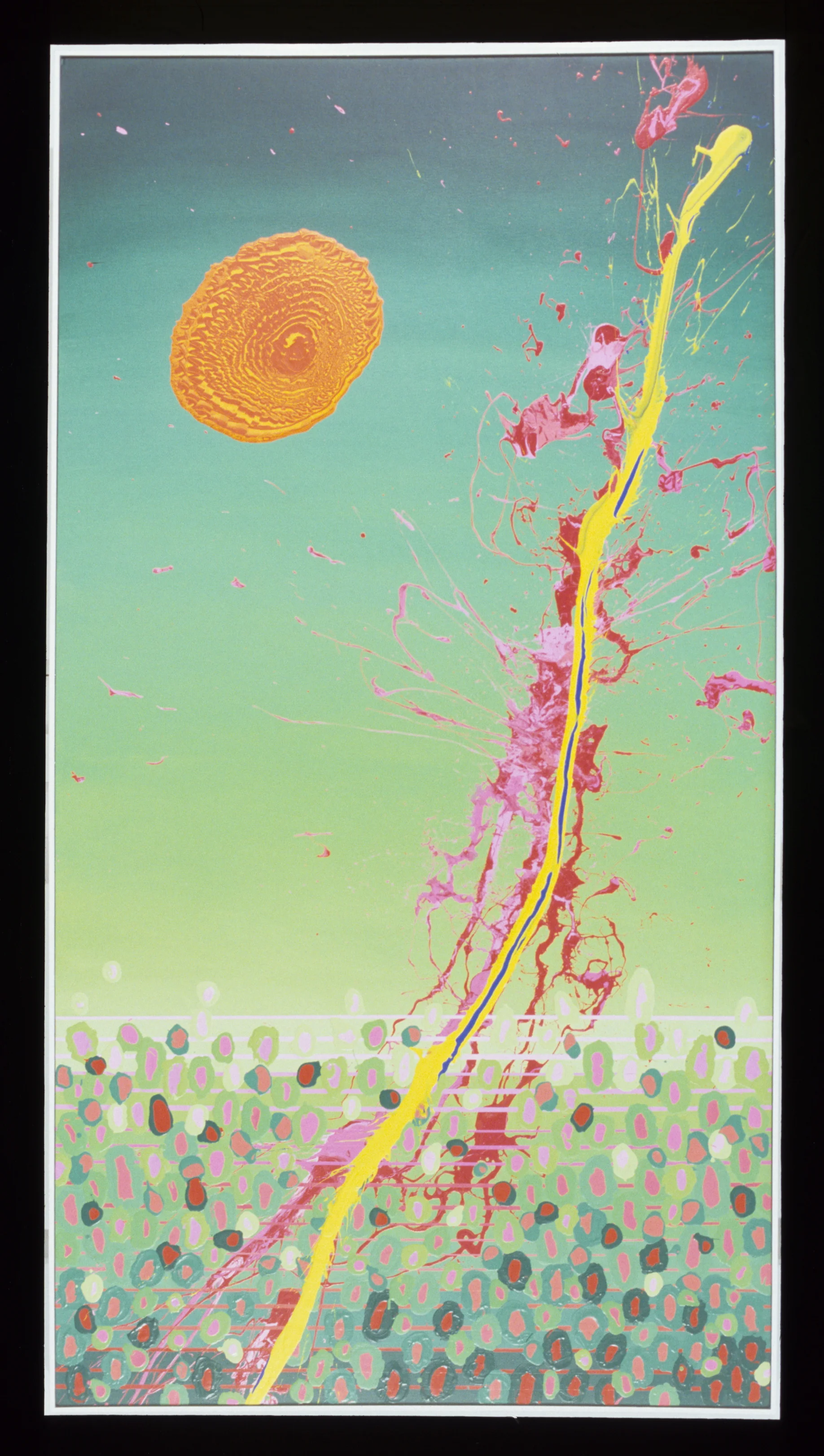 The Early San Francisco paintings mark a shift in my practice. The vertical color fields remain from earlier work, but now they serve as anchors for something more symbolic. Across each surface, a single gesture breaks through the structure—sometimes calm, sometimes abrupt—like a brief signal moving across space. This is also the period when the titles begin pairing a number with a short phrase, a format I carried into many future series. Looking back, these paintings sit at the point where structure and spontaneity begin to work together, opening a clearer path toward the ideas that shaped the years ahead.