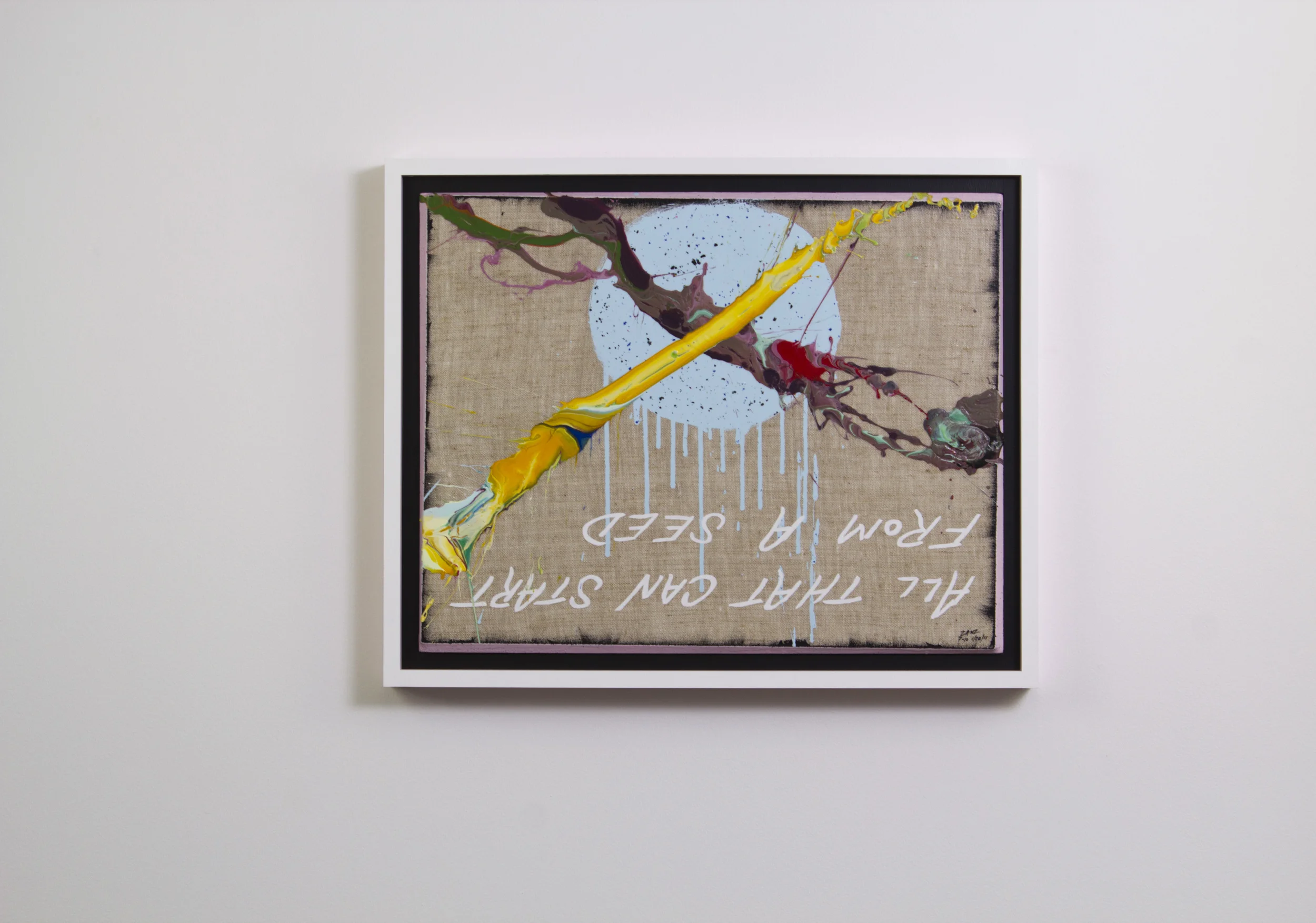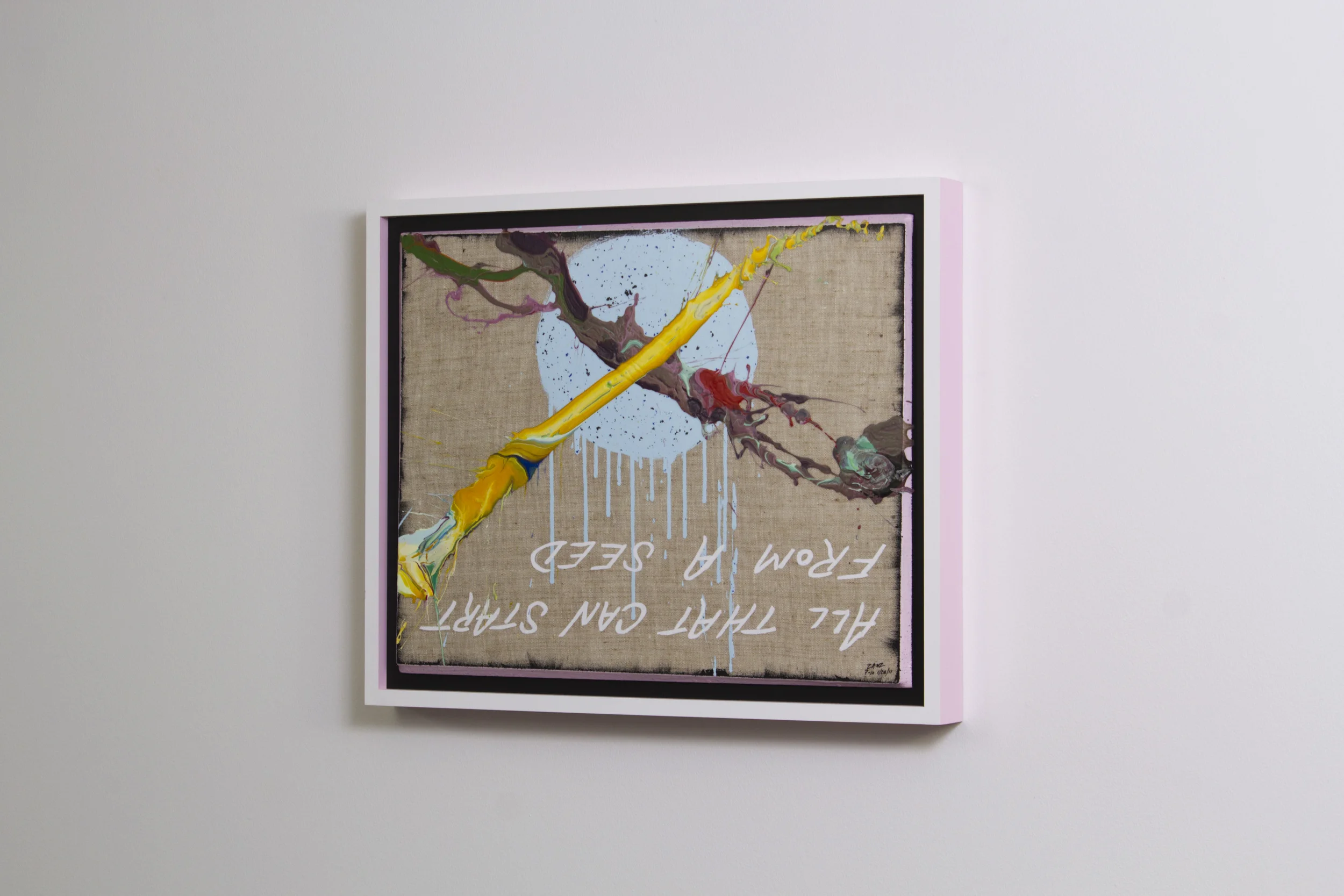 Across the installation, handwritten word-phrases tumble from one canvas to the next in a kind of visual somersaulting. They animate the piece without requiring electricity or interaction beyond looking and turning one’s body. Children turn instinctively; adults follow, becoming part of the work’s choreography. The text, made deliberately impermanent, will fade over time—leaving only the color, the movement of paint, and the residue of choices and chance.