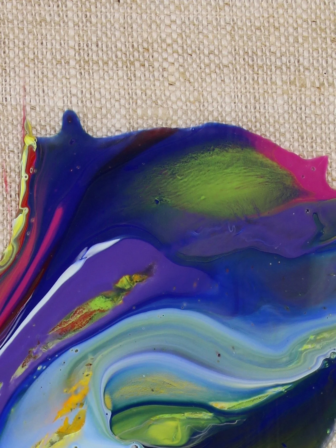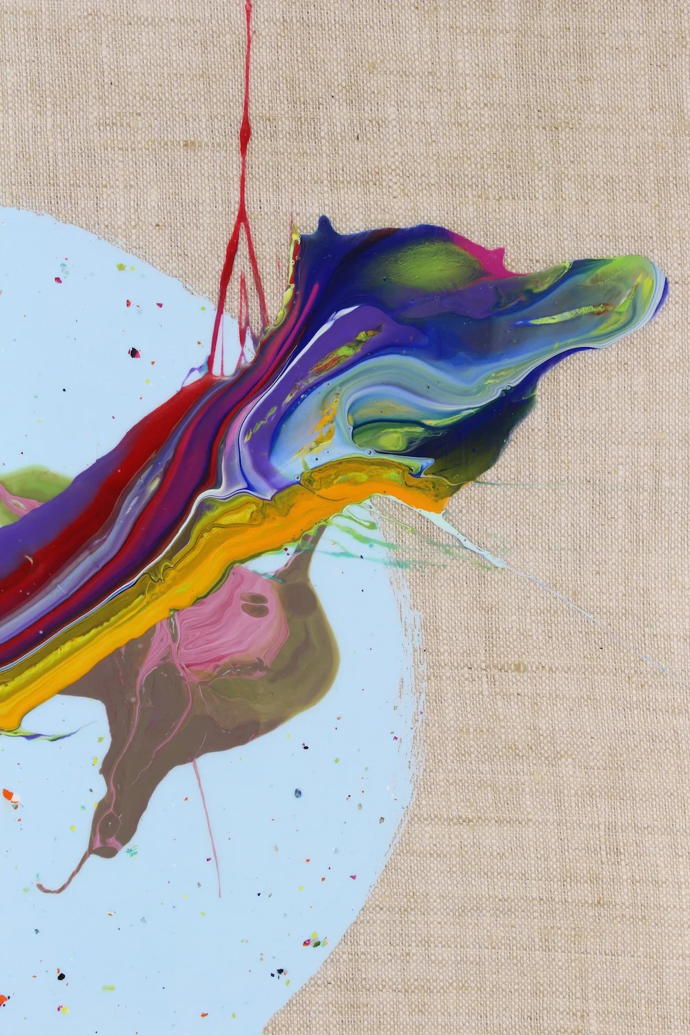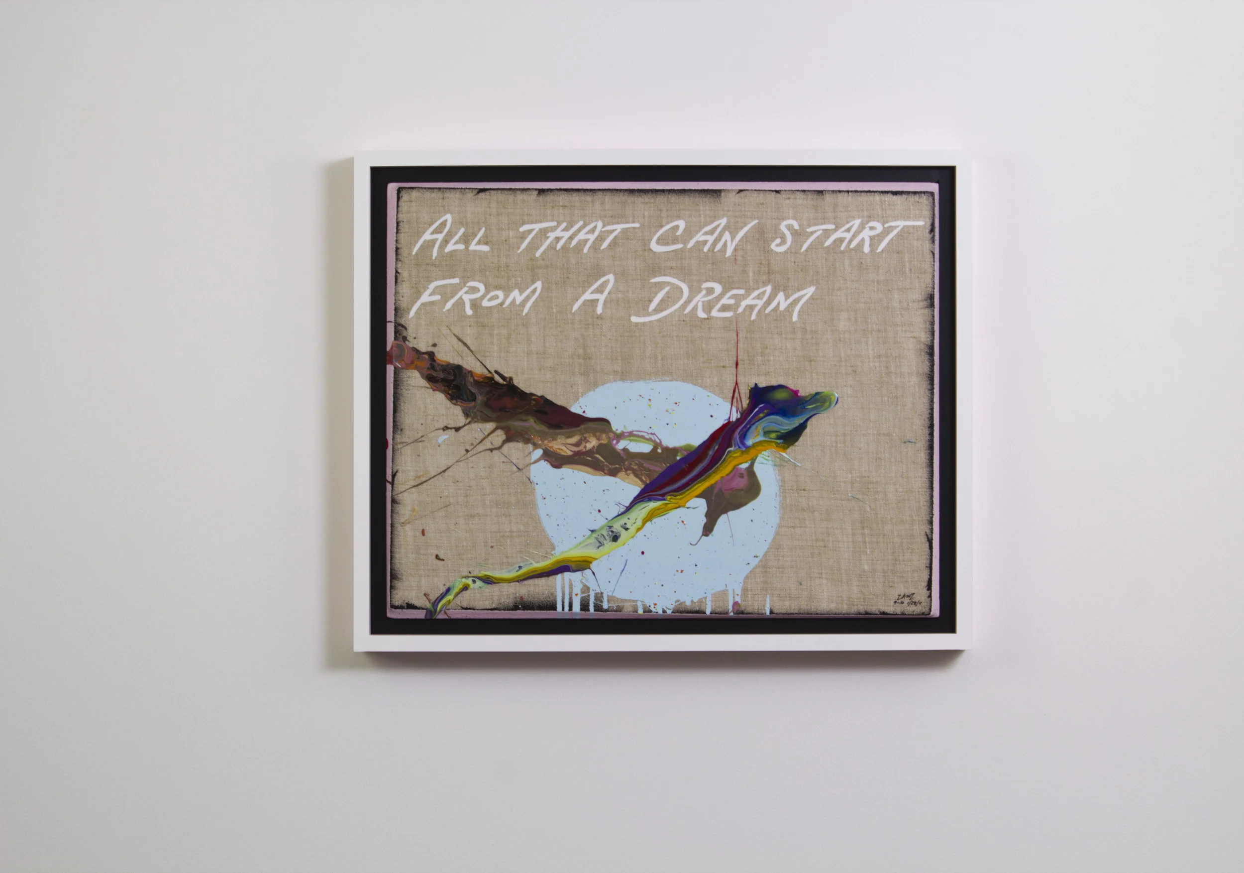Across the installation, handwritten word-phrases tumble from one canvas to the next in a kind of visual somersaulting. They animate the piece without requiring electricity or interaction beyond looking and turning one’s body. Children turn instinctively; adults follow, becoming part of the work’s choreography. The text, made deliberately impermanent, will fade over time—leaving only the color, the movement of paint, and the residue of choices and chance.