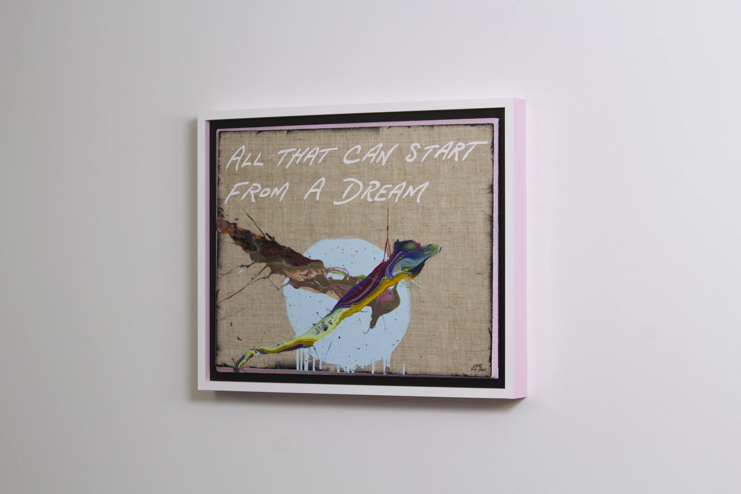 In each panel, controlled gesture meets intentional unpredictability through the artist’s signature technique, F.O.L.P. (Figure of Limited Predictability). These acts of release—where paint is allowed to stretch, separate, collide, and behave according to its own internal physics—anchor the series in a lineage of material-driven abstraction. F.O.L.P. functions as a conceptual engine: part discipline, part surrender. The work holds a structural spine beneath it, yet allows the medium to assert itself in ways that cannot be fully predetermined. What remains is a sequence that reads simultaneously as narrative and non-narrative, personal and anonymous, structured and impulsive. The result is a meditation on the way lives unfold—not in clean chapters, but in overlapping motions, fading words, accumulating color, and unplanned gestures that ultimately connect one moment to the next.