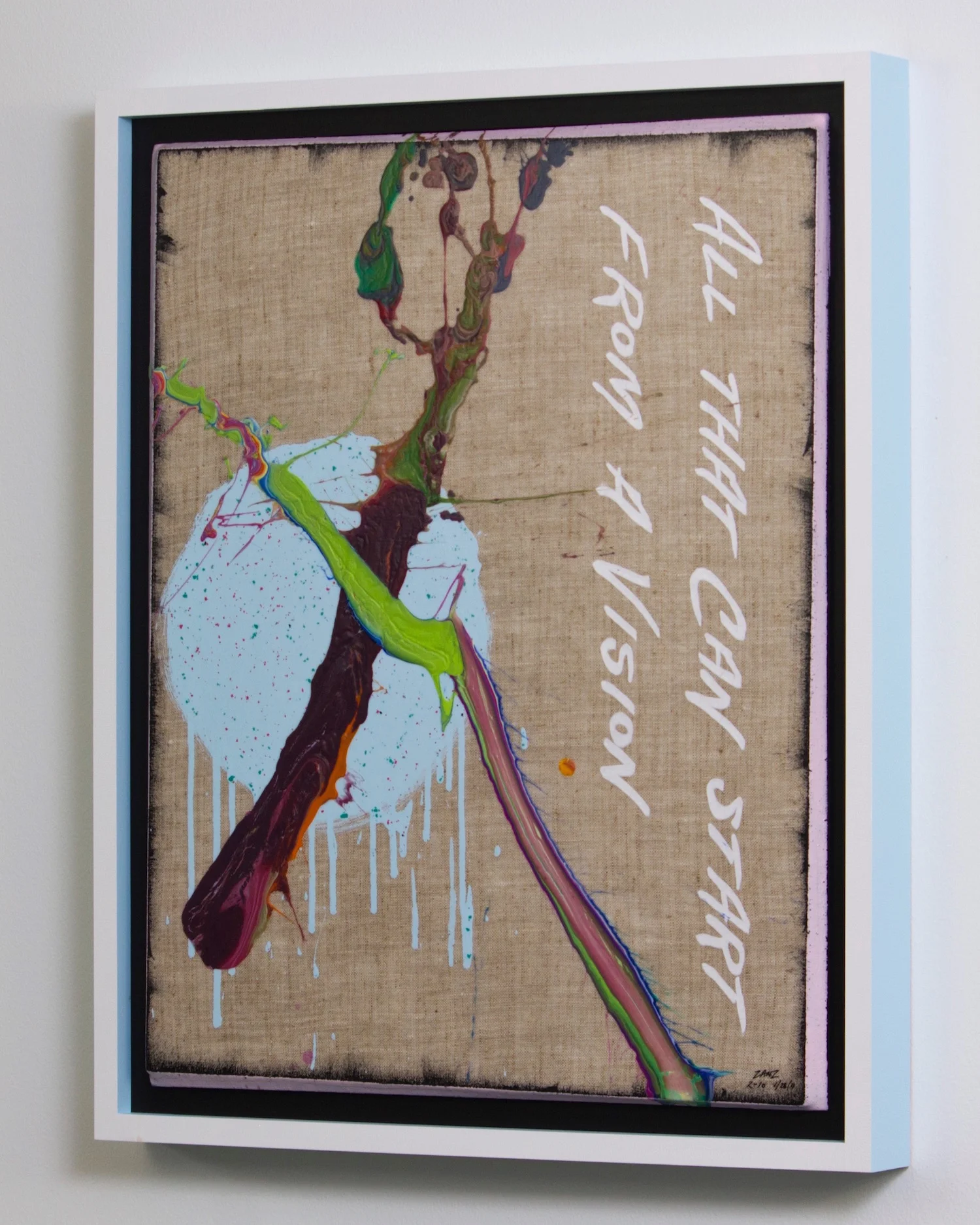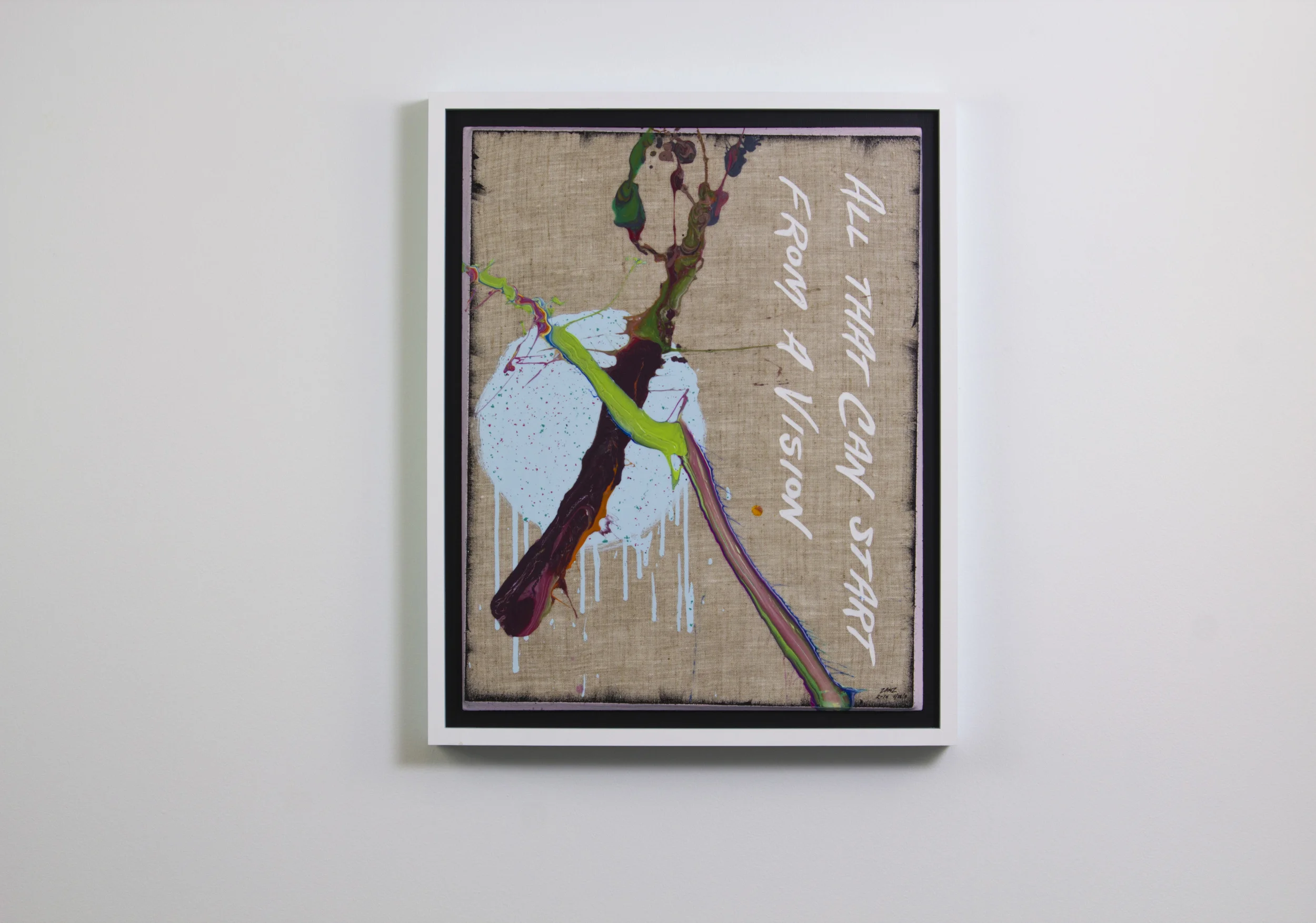 In each panel, controlled gesture meets intentional unpredictability through the artist’s signature technique, F.O.L.P. (Figure of Limited Predictability). These acts of release—where paint is allowed to stretch, separate, collide, and behave according to its own internal physics—anchor the series in a lineage of material-driven abstraction. F.O.L.P. functions as a conceptual engine: part discipline, part surrender. The work holds a structural spine beneath it, yet allows the medium to assert itself in ways that cannot be fully predetermined. What remains is a sequence that reads simultaneously as narrative and non-narrative, personal and anonymous, structured and impulsive. The result is a meditation on the way lives unfold—not in clean chapters, but in overlapping motions, fading words, accumulating color, and unplanned gestures that ultimately connect one moment to the next.