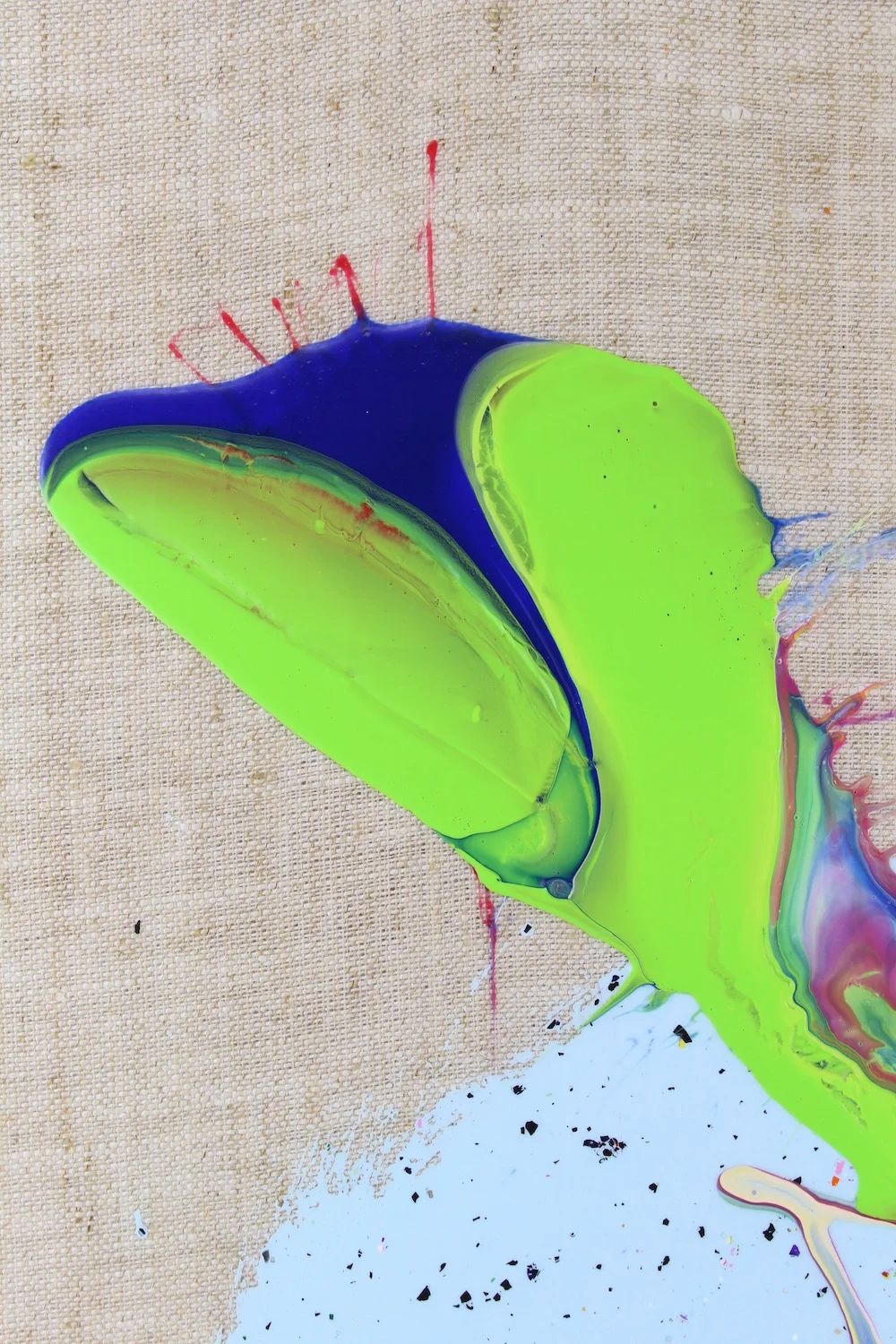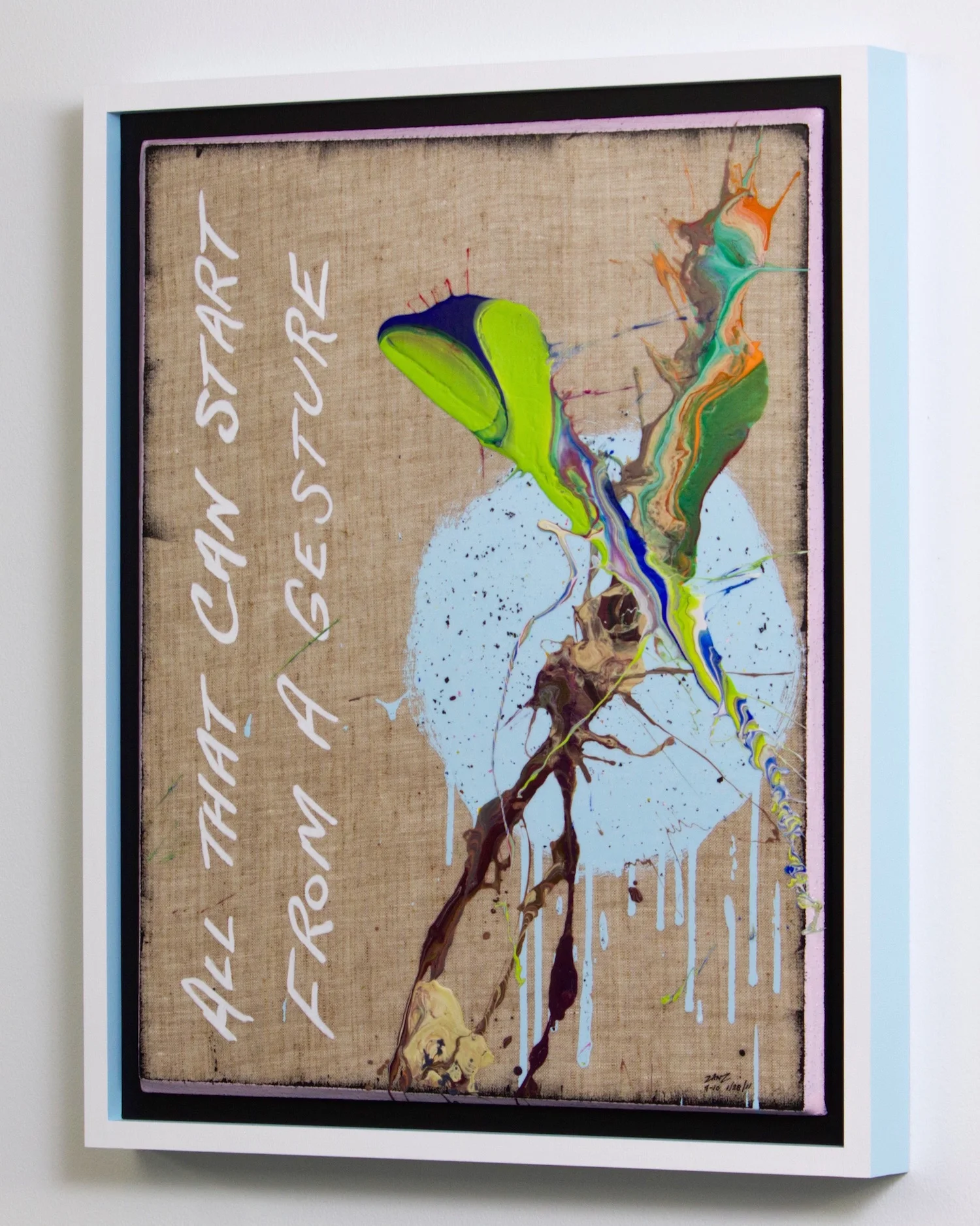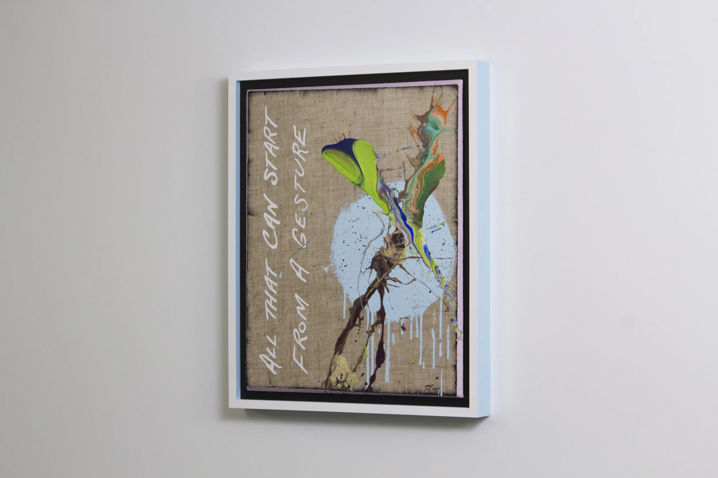 Across the installation, handwritten word-phrases tumble from one canvas to the next in a kind of visual somersaulting. They animate the piece without requiring electricity or interaction beyond looking and turning one’s body. Children turn instinctively; adults follow, becoming part of the work’s choreography. The text, made deliberately impermanent, will fade over time—leaving only the color, the movement of paint, and the residue of choices and chance.