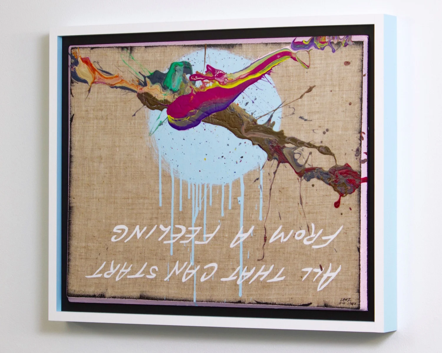 In each panel, controlled gesture meets intentional unpredictability through the artist’s signature technique, F.O.L.P. (Figure of Limited Predictability). These acts of release—where paint is allowed to stretch, separate, collide, and behave according to its own internal physics—anchor the series in a lineage of material-driven abstraction. F.O.L.P. functions as a conceptual engine: part discipline, part surrender. The work holds a structural spine beneath it, yet allows the medium to assert itself in ways that cannot be fully predetermined. What remains is a sequence that reads simultaneously as narrative and non-narrative, personal and anonymous, structured and impulsive. The result is a meditation on the way lives unfold—not in clean chapters, but in overlapping motions, fading words, accumulating color, and unplanned gestures that ultimately connect one moment to the next.