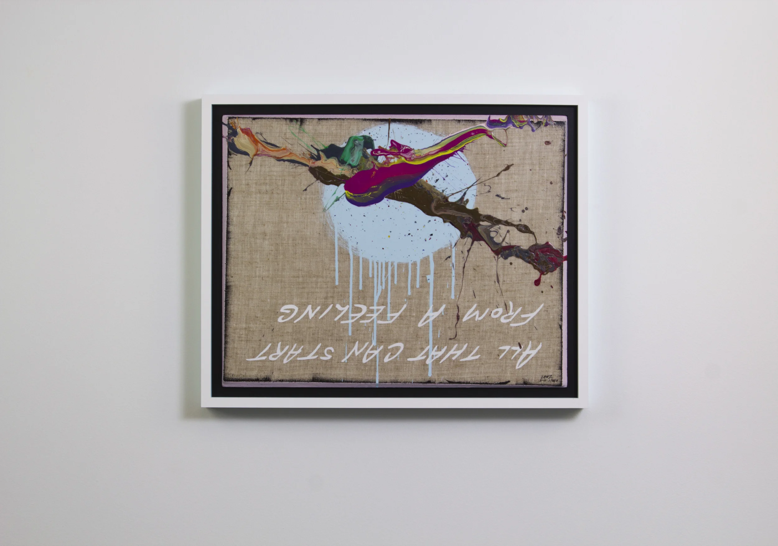 Across the installation, handwritten word-phrases tumble from one canvas to the next in a kind of visual somersaulting. They animate the piece without requiring electricity or interaction beyond looking and turning one’s body. Children turn instinctively; adults follow, becoming part of the work’s choreography. The text, made deliberately impermanent, will fade over time—leaving only the color, the movement of paint, and the residue of choices and chance.