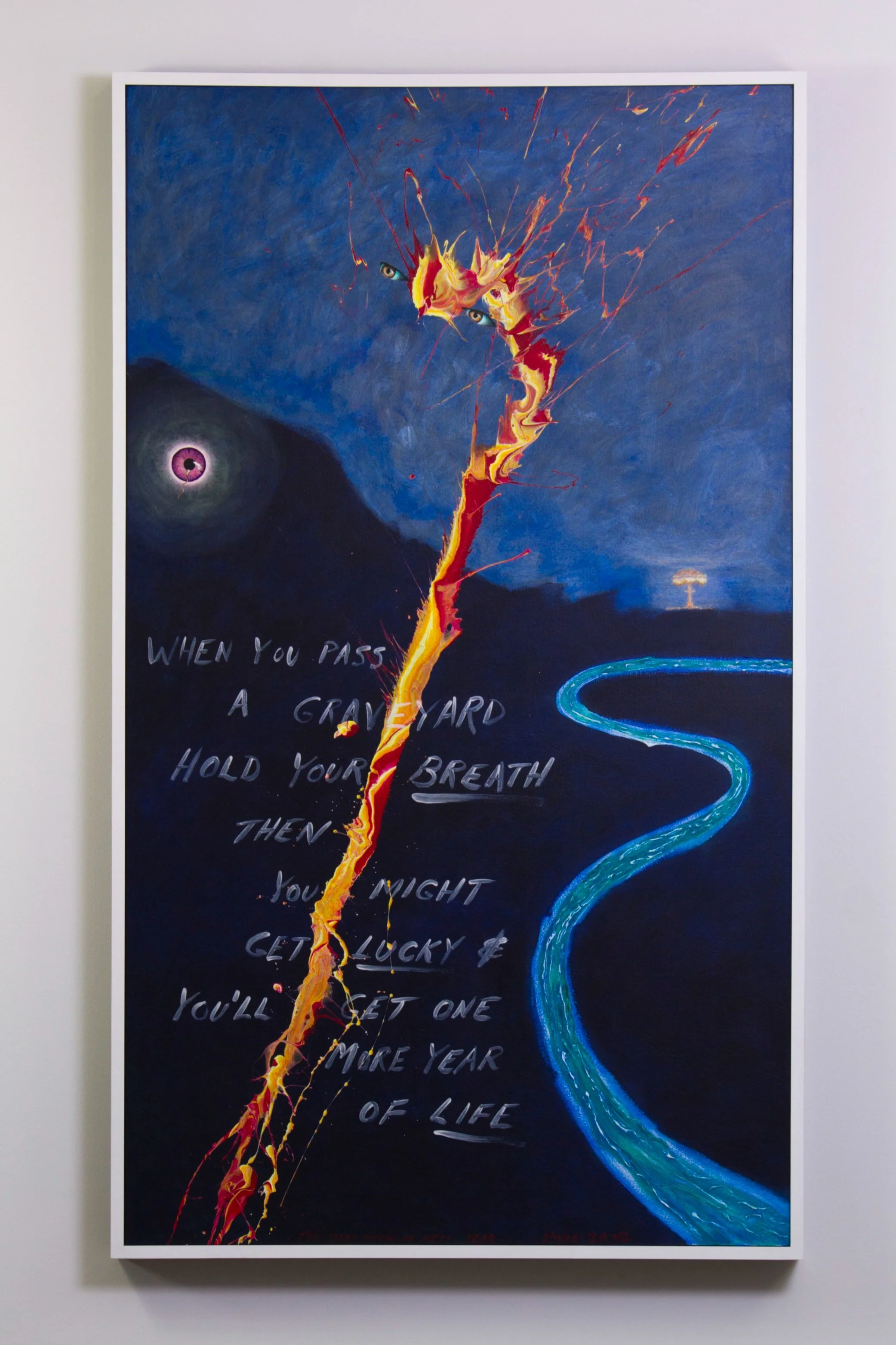 This series introduces painted eyes and early F.O.L.P. (Figure of Limited Predictability) gestures as points of awareness within each painting. Text, perception, and physical paint coexist on the surface, allowing images to emerge through a balance of intention and unpredictability rather than design.