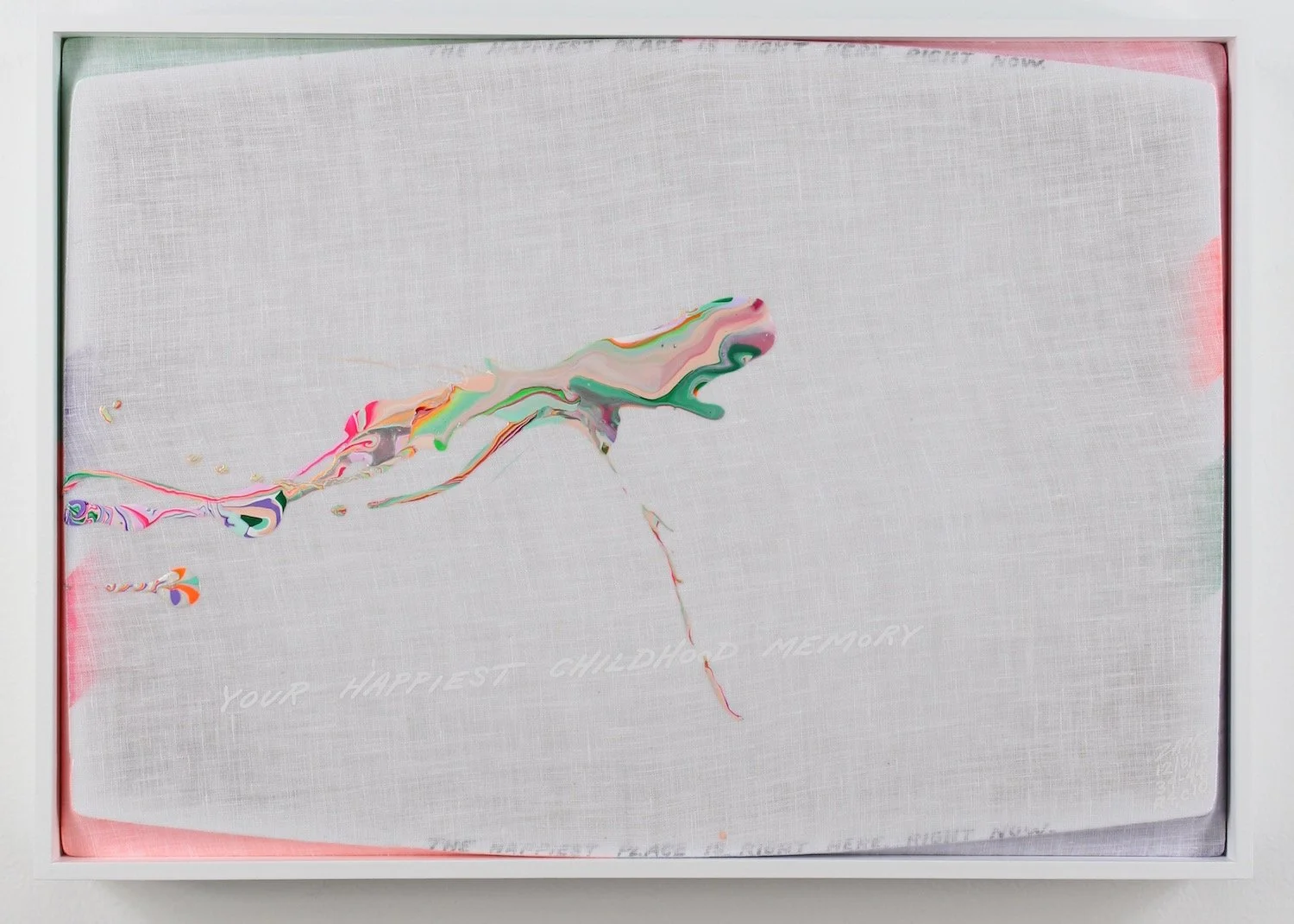 "YOUR HAPPIEST CHILDHOOD MEMORY" (white lettering). "THE HAPPIEST PLACE IS RIGHT HERE, RIGHT NOW"  (small black lettering diffused along the top and bottom edges).