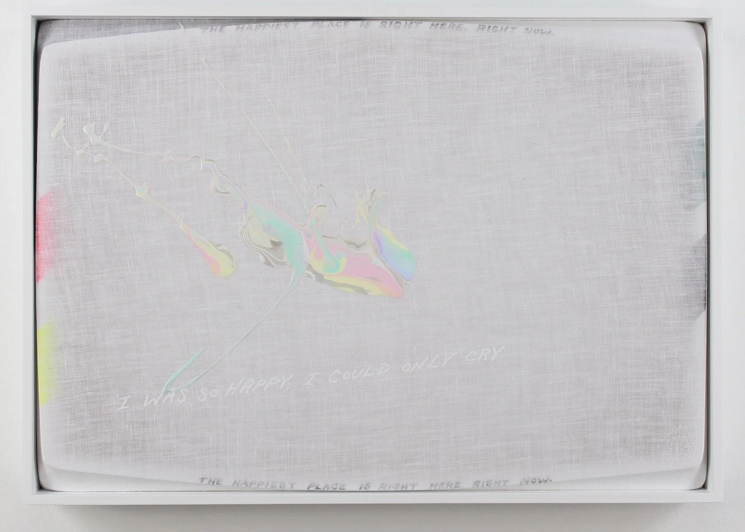 "I WAS SO HAPPY, I COULD ONLY CRY" (white lettering). "THE HAPPIEST PLACE IS RIGHT HERE, RIGHT NOW" (small black lettering diffused along the top and bottom edges).