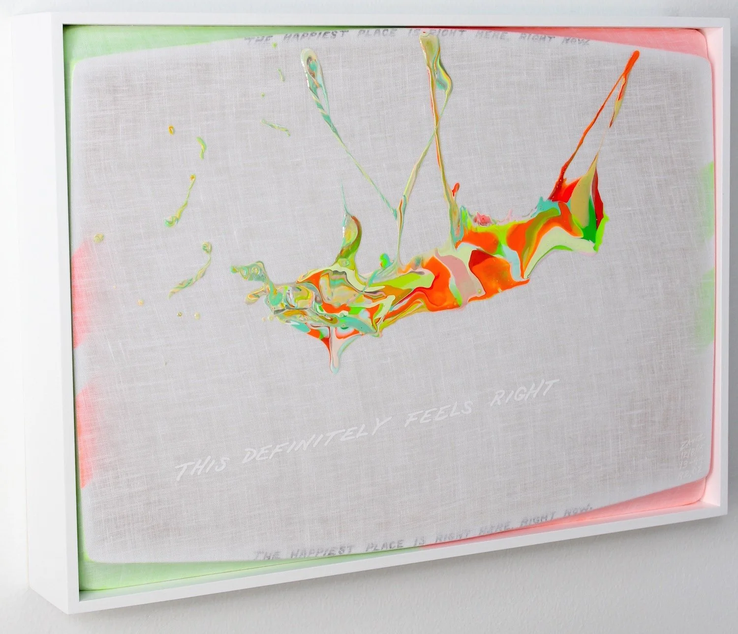 "THIS DEFINITELY FEELS RIGHT" (white lettering). "THE HAPPIEST PLACE IS RIGHT HERE, RIGHT NOW" (small black lettering diffused along the top and bottom edge).