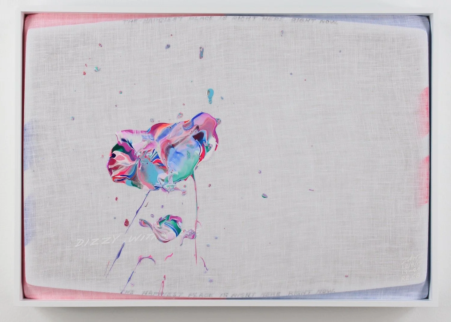 "DIZZY WITH LOVE" (white lettering). "THE HAPPIEST PLACE IS RIGHT HERE, RIGHT NOW"  (small black lettering diffused along the top and bottom edges).