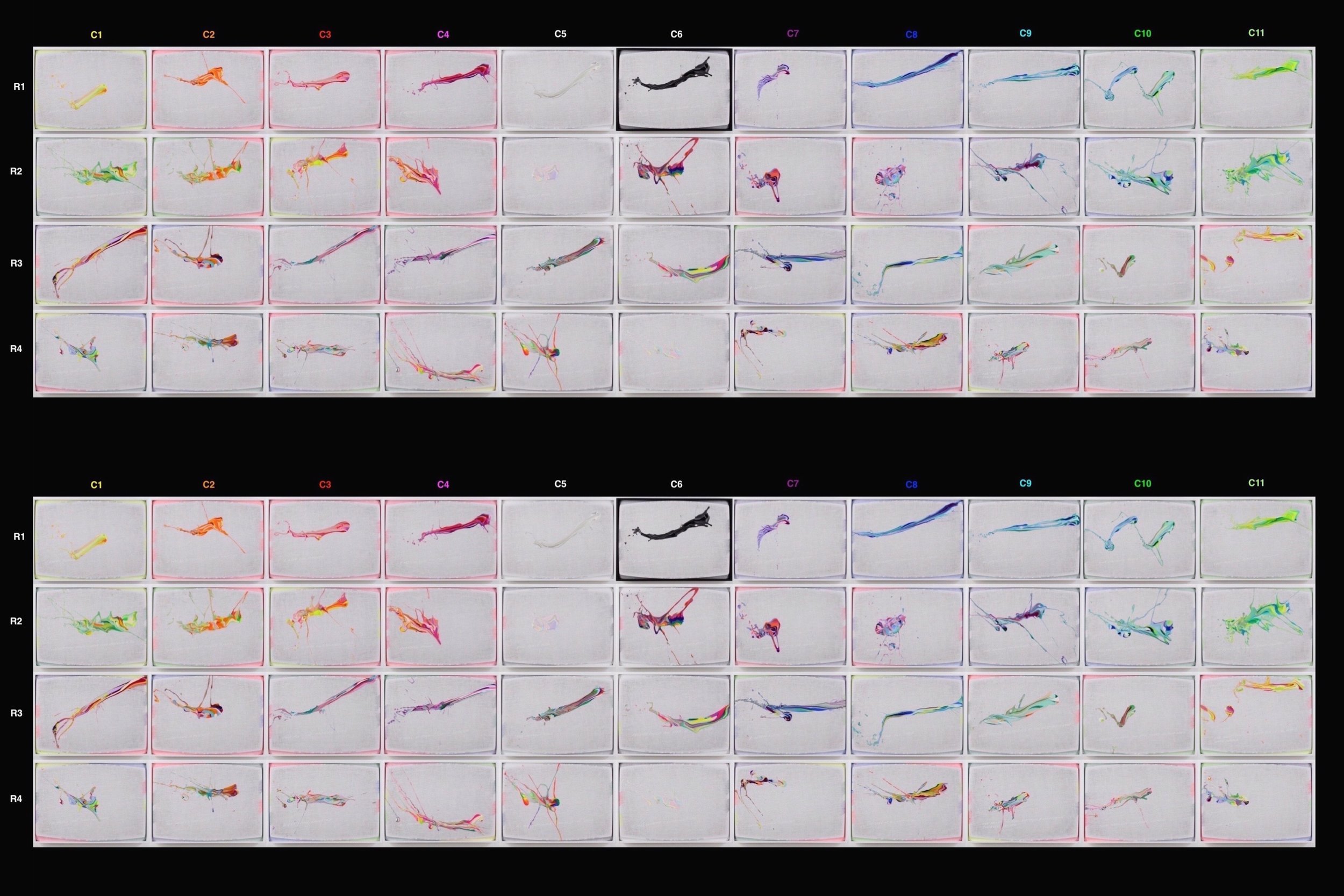 Every piece contains a unique F.O.L.P. (Figure Of Limited Predictability) — a controlled release of hand-mixed pigment from a shaped Color Wand. The paint spreads into an organic form shaped by viscosity, color order, and the physics of impact — a balance between intention and unpredictability.