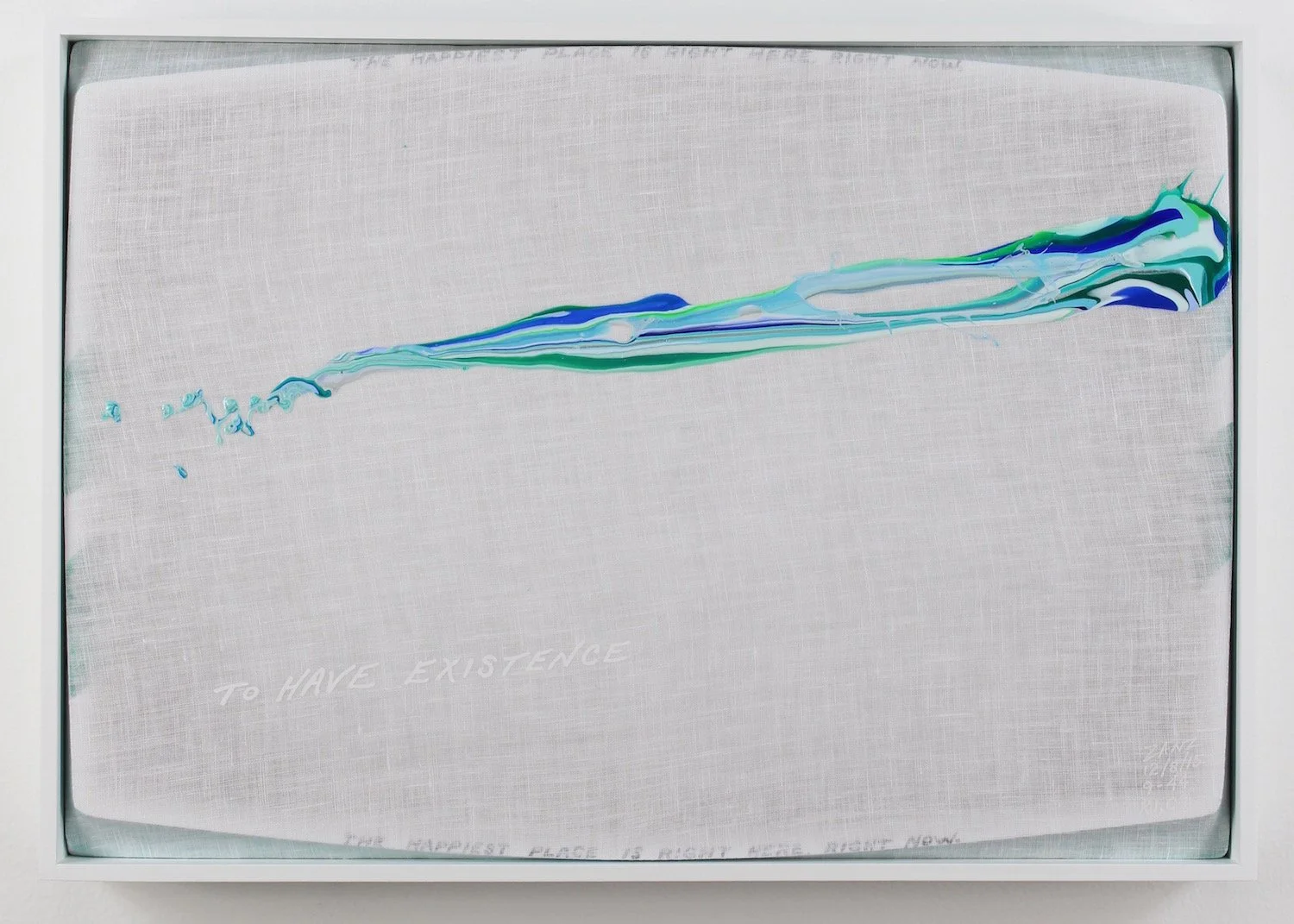 "TO HAVE EXISTENCE" (white lettering). "THE HAPPIEST PLACE IS RIGHT HERE, RIGHT NOW"  (small black lettering diffused along the top and bottom edges).