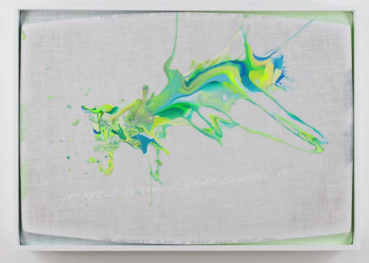 "IT FEELS SO GOOD, I CAN'T CONTROL IT" (white lettering). "THE HAPPIEST PLACE IS RIGHT HERE, RIGHT NOW" (small black lettering diffused along the top and bottom edges).