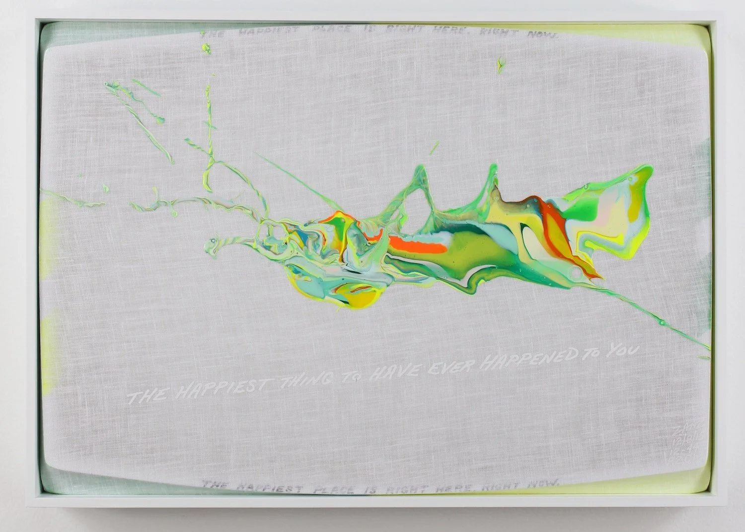"THE HAPPIEST THING TO HAVE EVER HAPPENED TO YOU" (white lettering). "THE HAPPIEST PLACE IS RIGHT HERE, RIGHT NOW"  (small black lettering diffused along the top and bottom edges).