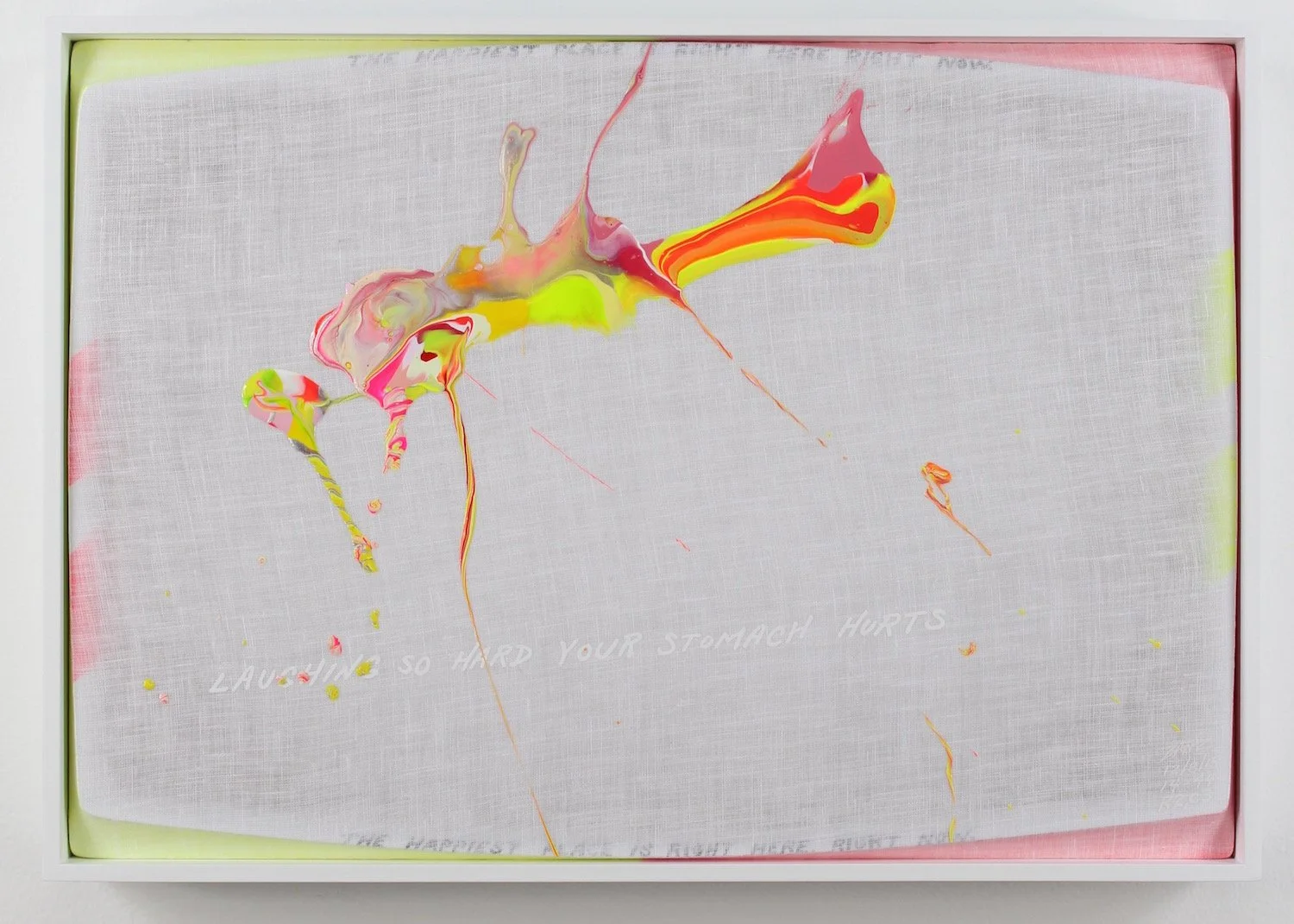 "LAUGHING SO HARD YOUR STOMACH HURTS" (white lettering). "THE HAPPIEST PLACE IS RIGHT HERE, RIGHT NOW" (small black lettering diffused along the top and bottom edges).