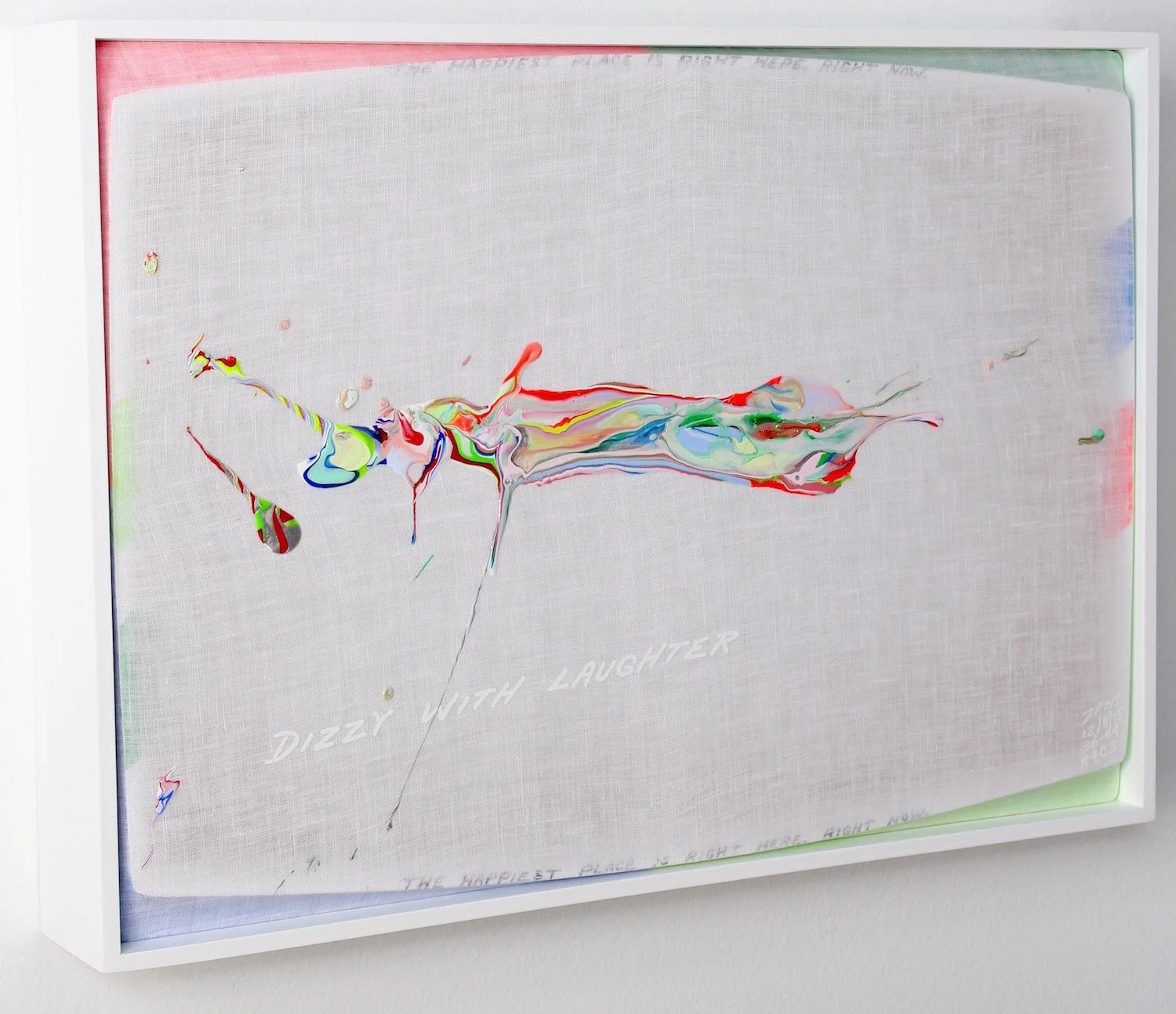 "DIZZY WITH LAUGHTER" (white lettering). "THE HAPPIEST PLACE IS RIGHT HERE, RIGHT NOW" (small black lettering diffused along the top and bottom edges).
