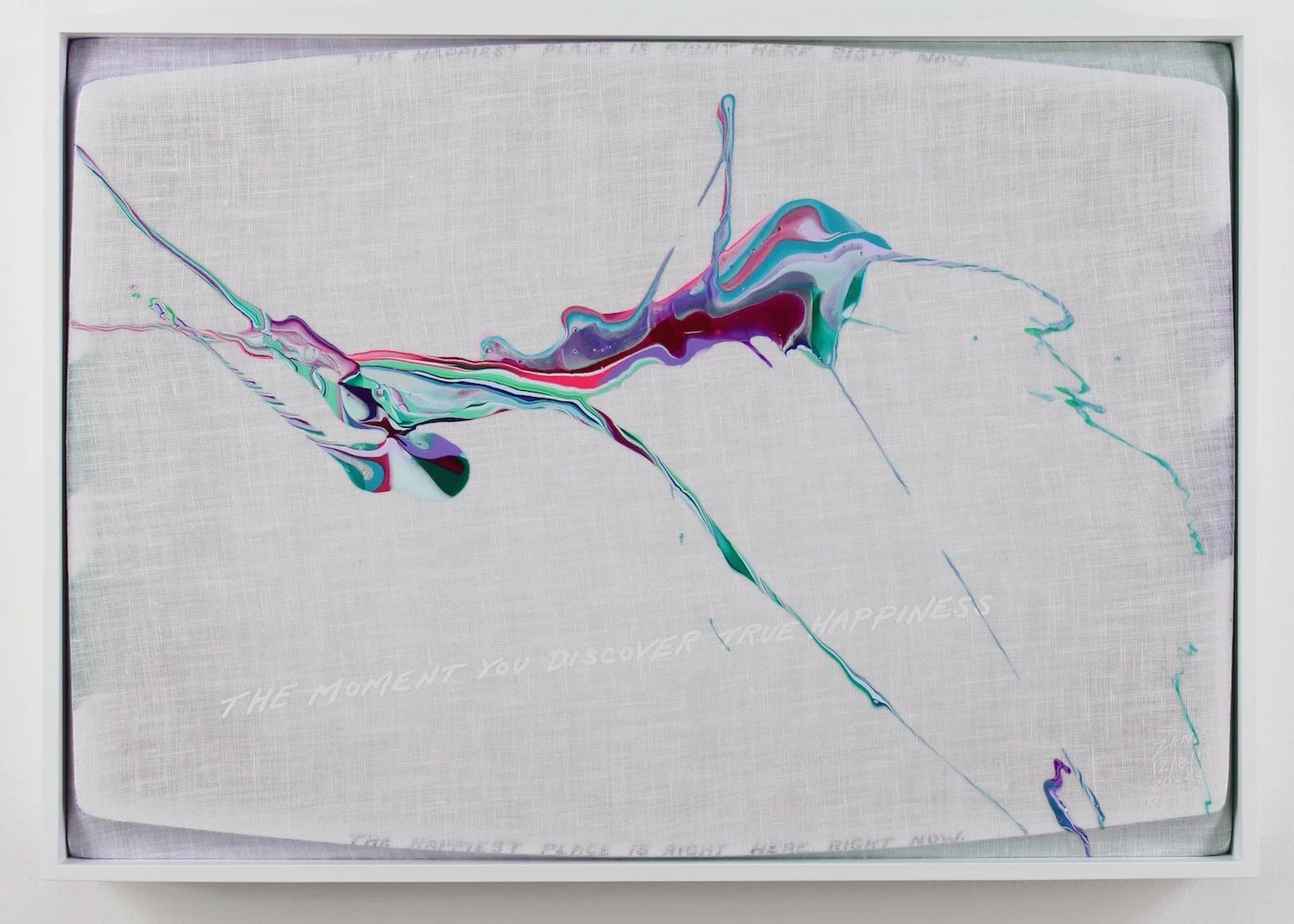 "THE MOMENT YOU DISCOVER TRUE HAPPINESS" (white lettering). "THE HAPPIEST PLACE IS RIGHT HERE, RIGHT NOW" (small black lettering diffused along the top and bottom edges).