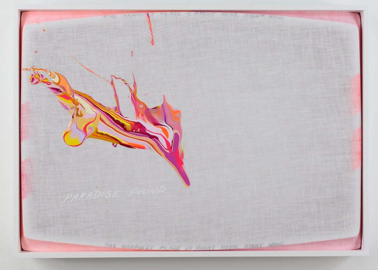 "PARADISE FOUND" (white lettering). "THE HAPPIEST PLACE IS RIGHT HERE, RIGHT NOW"  (small black lettering diffused along the top and bottom edges).