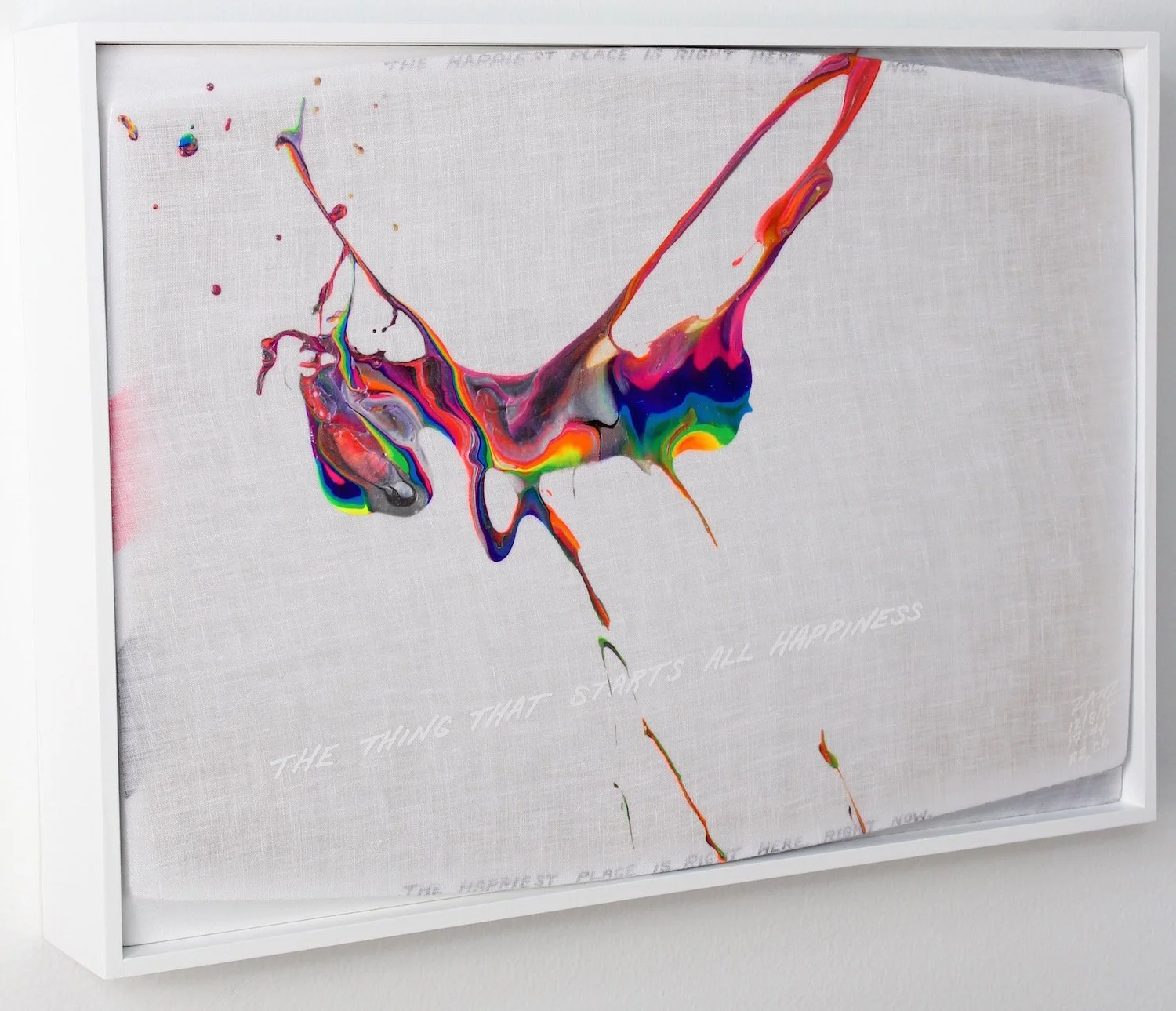 Every piece contains a unique F.O.L.P. (Figure Of Limited Predictability) — a controlled release of hand-mixed pigment from a shaped Color Wand. The paint spreads into an organic form shaped by viscosity, color order, and the physics of impact — a balance between intention and unpredictability.