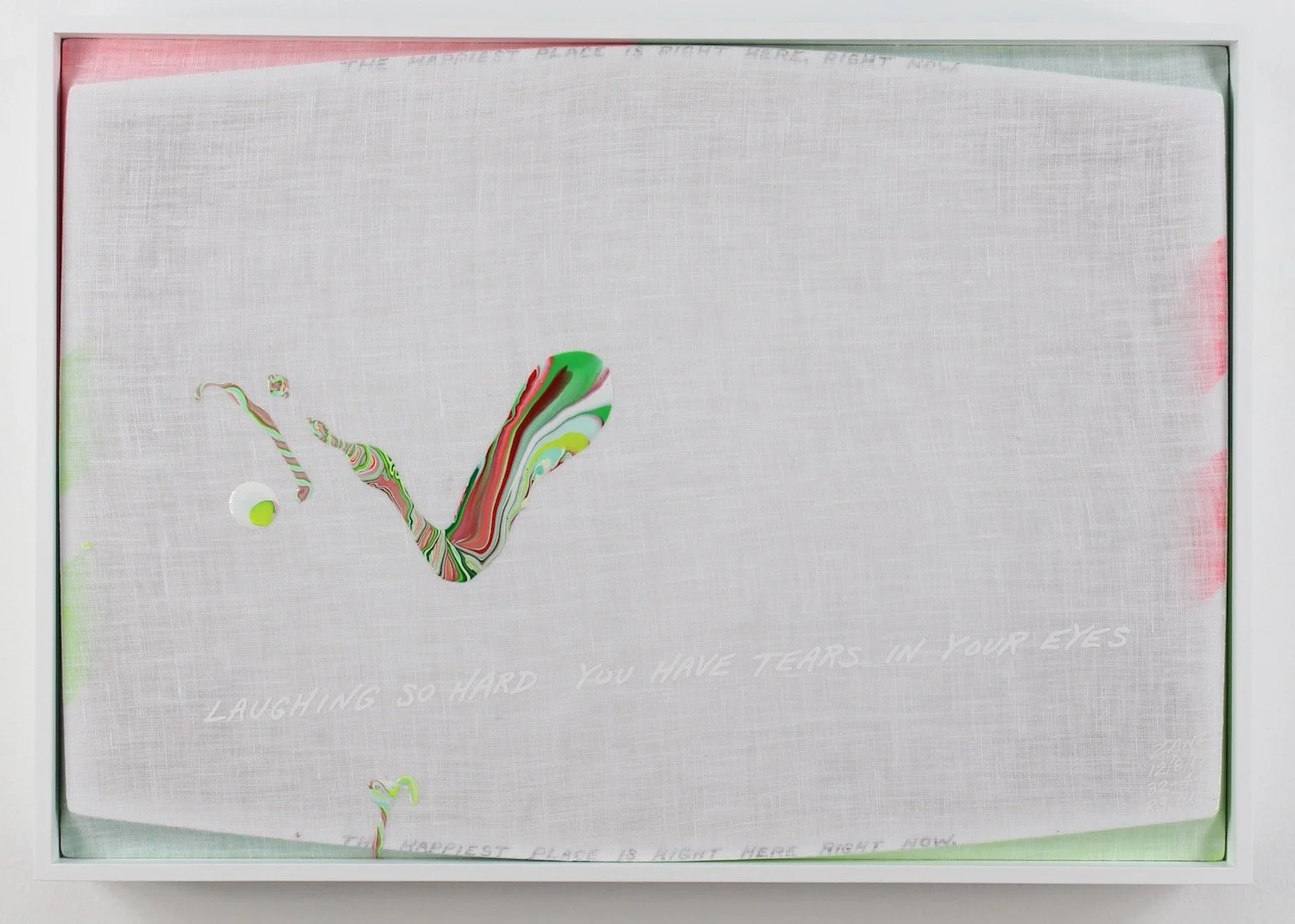 "LAUGHING SO HARD YOU HAVE TEARS IN YOUR EYES" (white lettering). "THE HAPPIEST PLACE IS RIGHT HERE, RIGHT NOW"  (small black lettering diffused along the top and bottom edges).