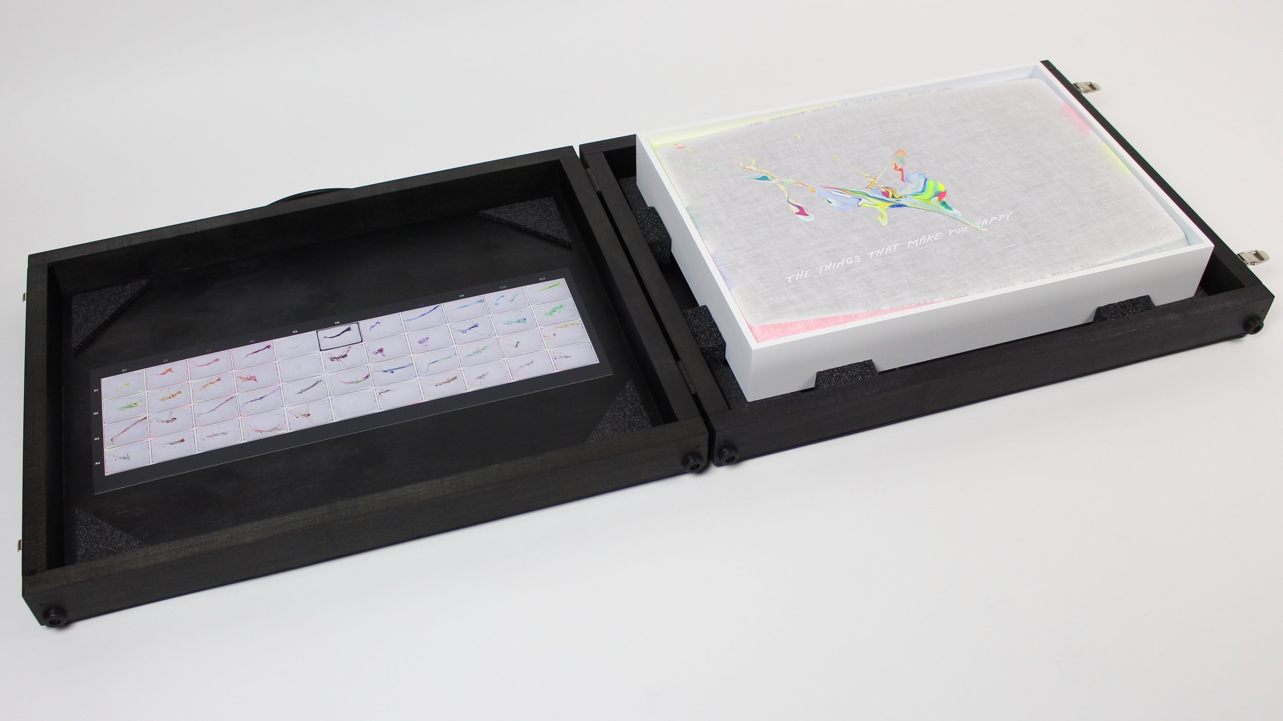 Each painting rests inside a custom black briefcase-style box, its lid lined with the full 44-piece color study chart. Beneath each linen surface is a repeating phrase: "The happiest place is right here, right now."