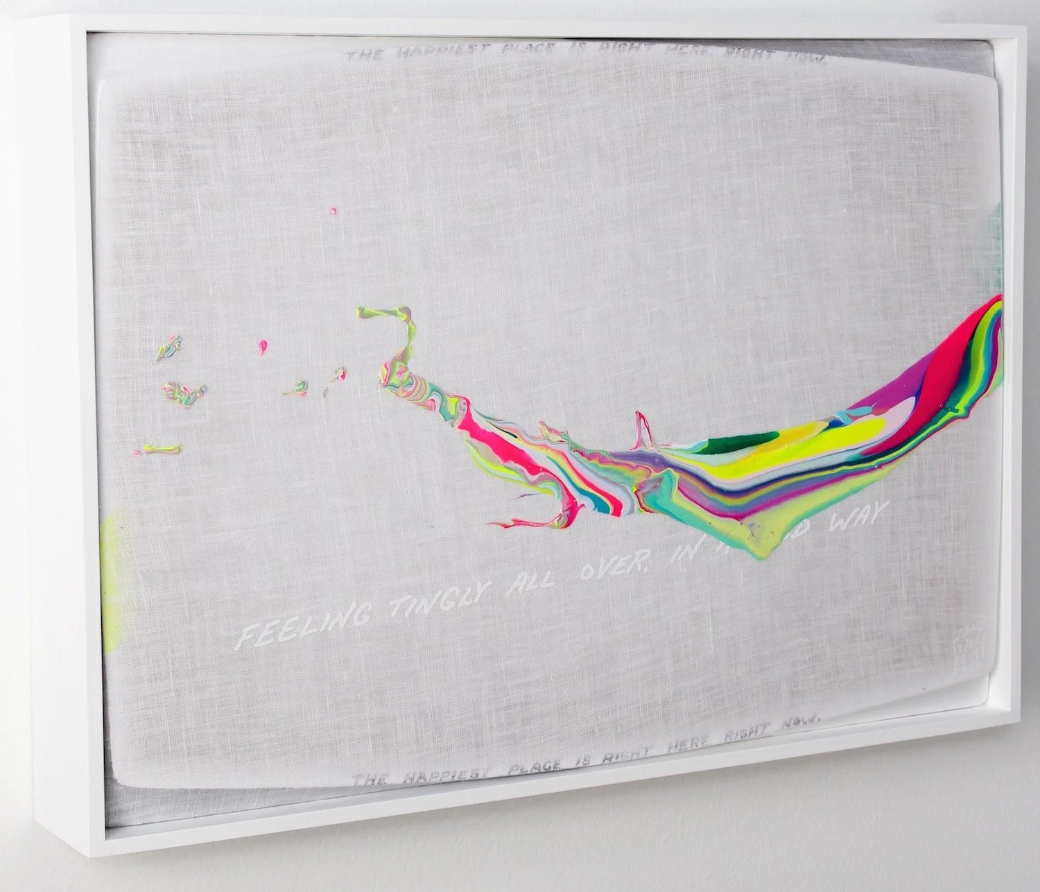 "FEELING TINGLY ALL OVER, IN A GOOD WAY" (white lettering). "THE HAPPIEST PLACE IS RIGHT HERE, RIGHT NOW" (small black lettering diffused along the top and bottom edges).