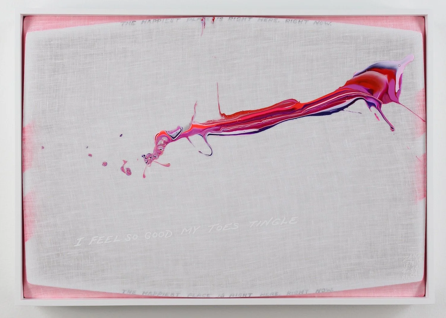 "I FEEL SO GOOD MY TOES TINGLE" (white lettering). "THE HAPPIEST PLACE IS RIGHT HERE, RIGHT NOW"  (small black lettering diffused along the top and bottom edges).