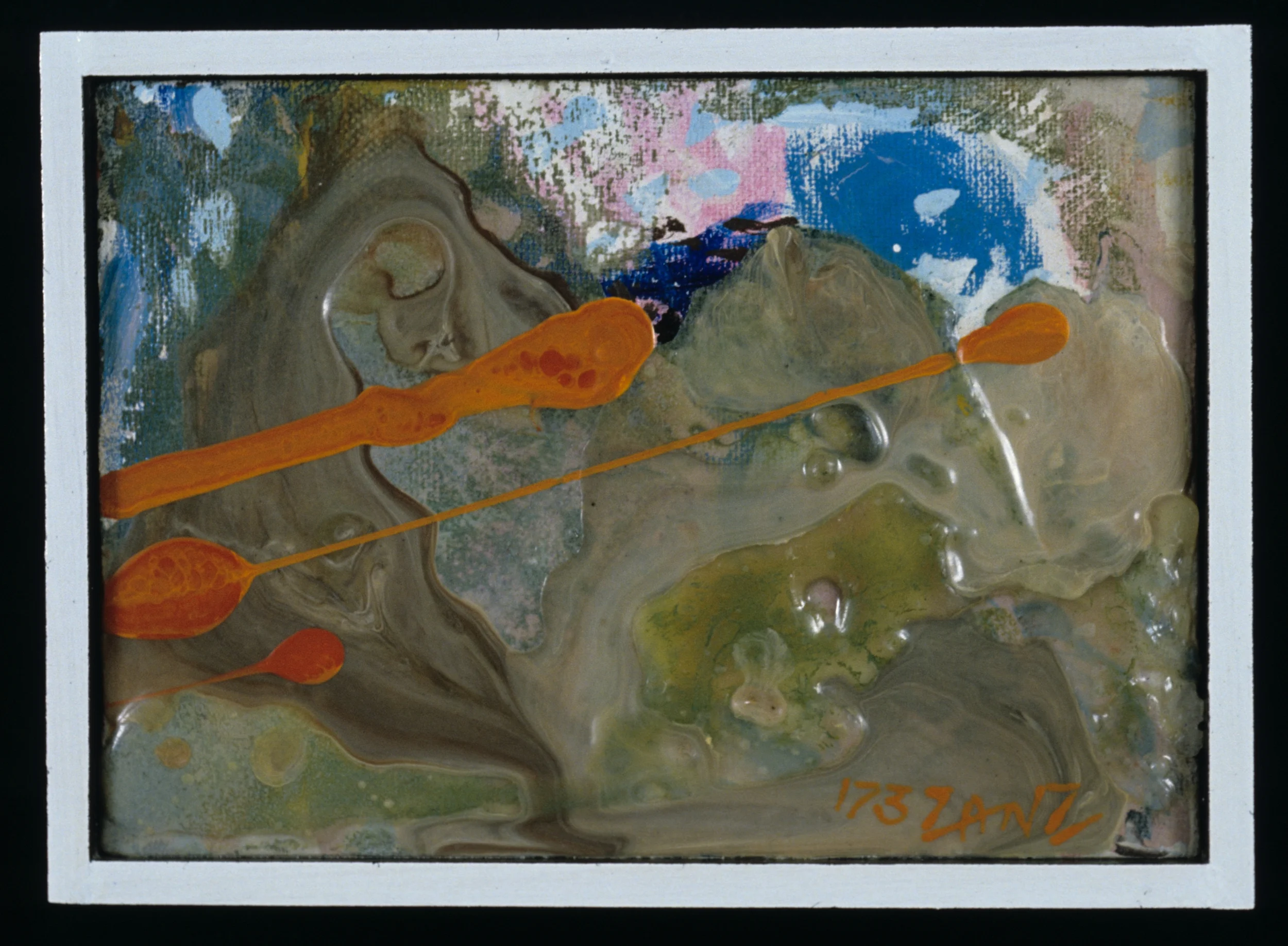 acrylic, enamel, encaustic, polyurethane on canvas framed