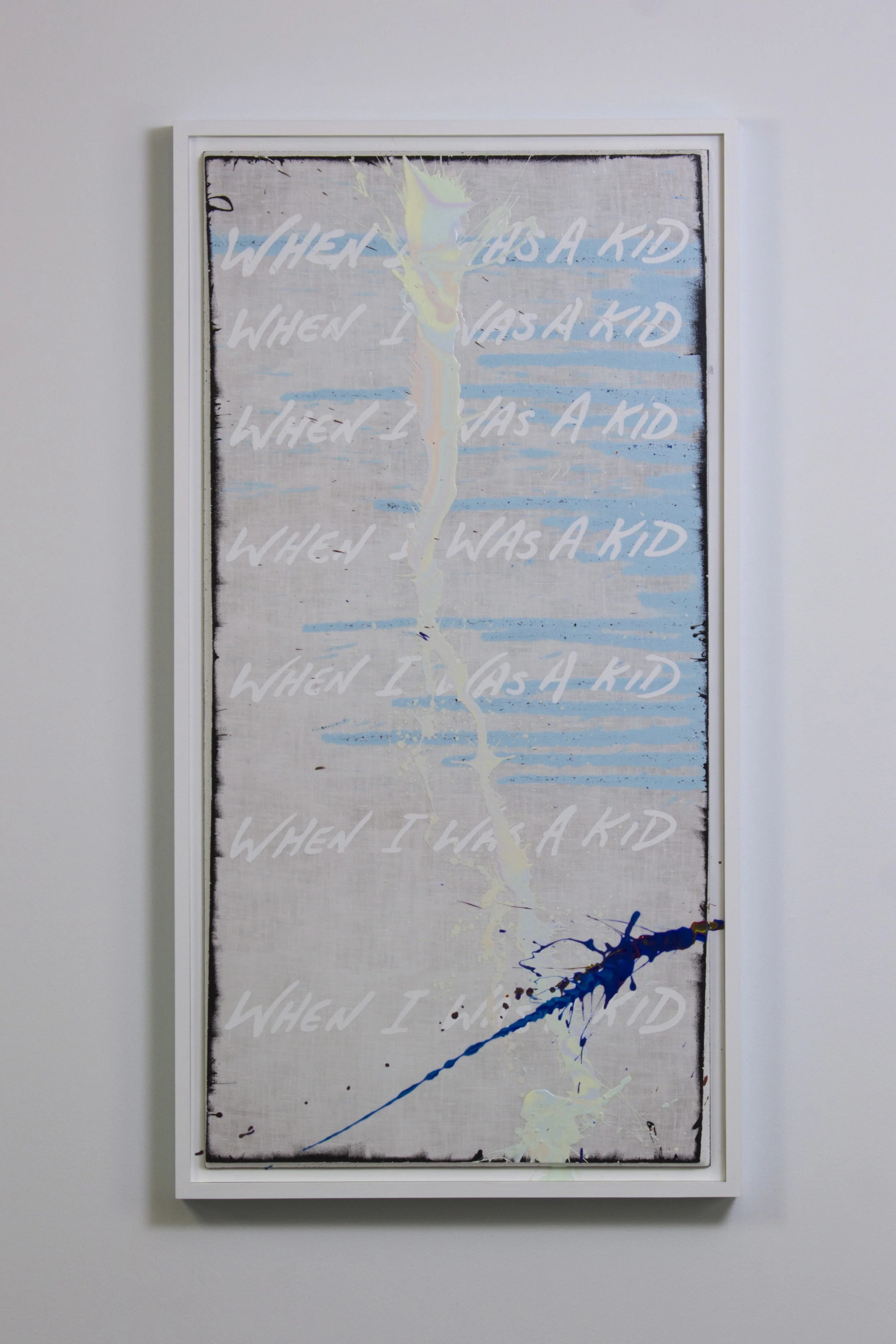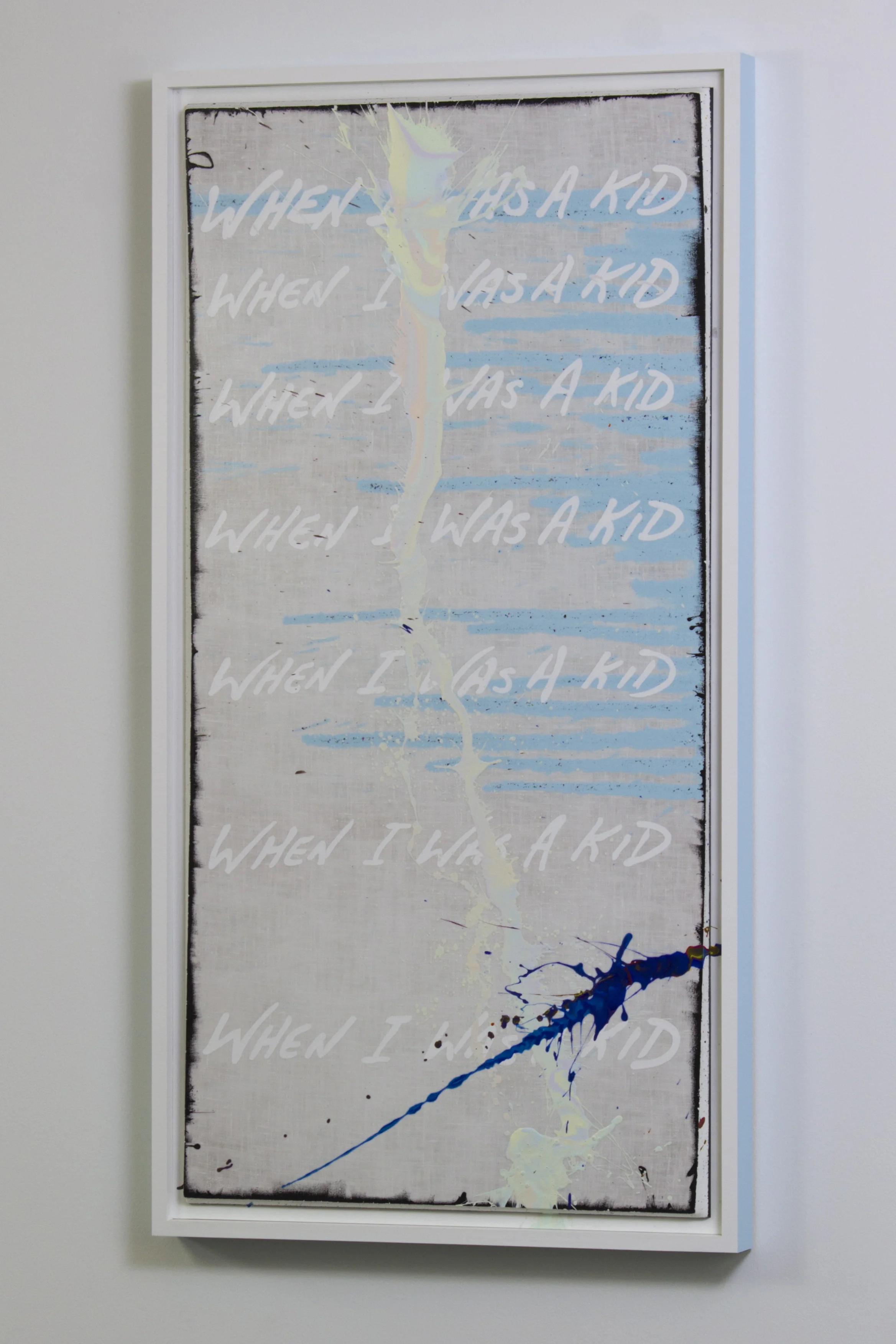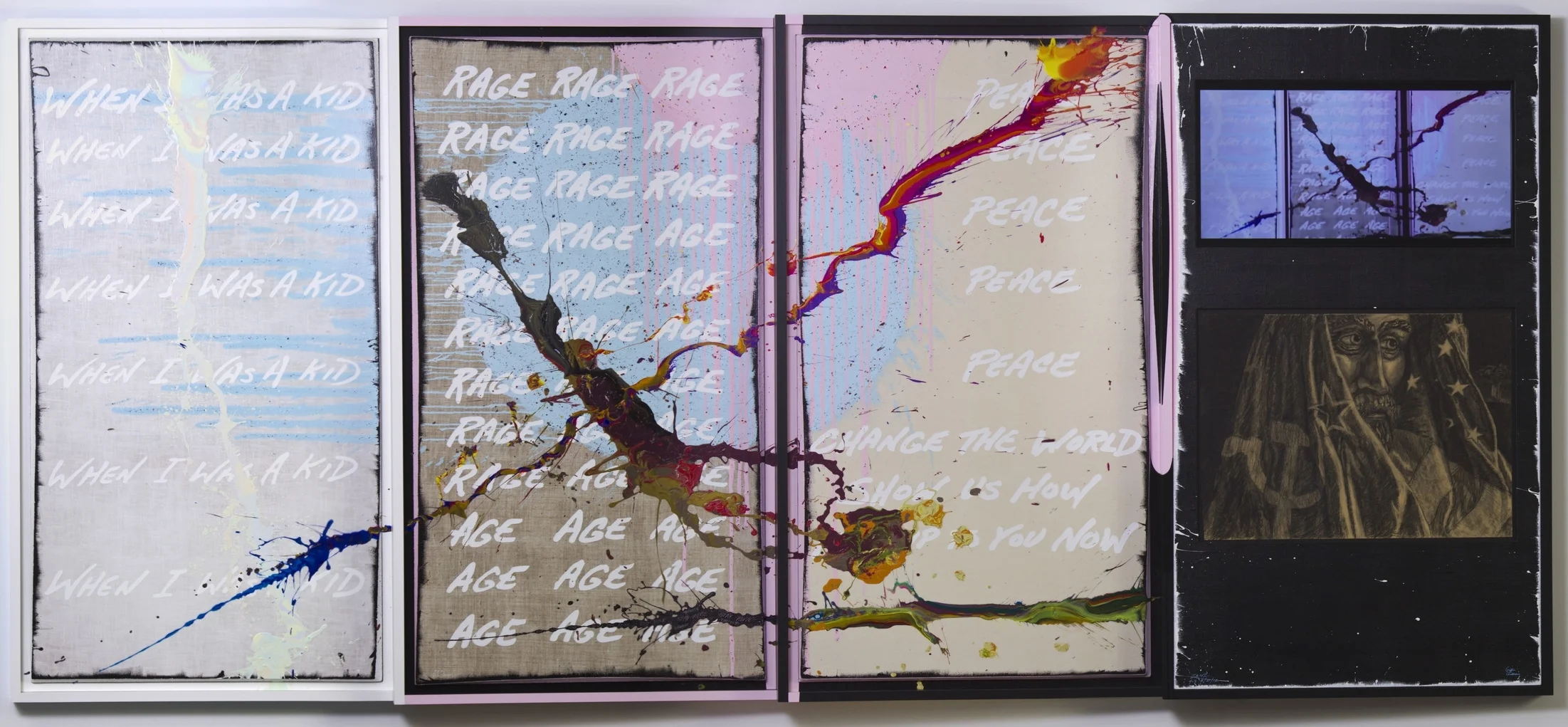 • Life Cycle-4 is an installation painting composed of four overlapping panels—Childhood, Midlife, Old Age, and Death—each marking a distinct stage in the arc of a human life. The text shifts from “WHEN I WAS A KID” to “AGE/RAGE” to “PEACE,” mirroring the emotional progression from innocence to volatility to acceptance. Each panel contains a F.O.L.P. (Figure of Limited Predictability) paint event, forming the connective thread across the work.