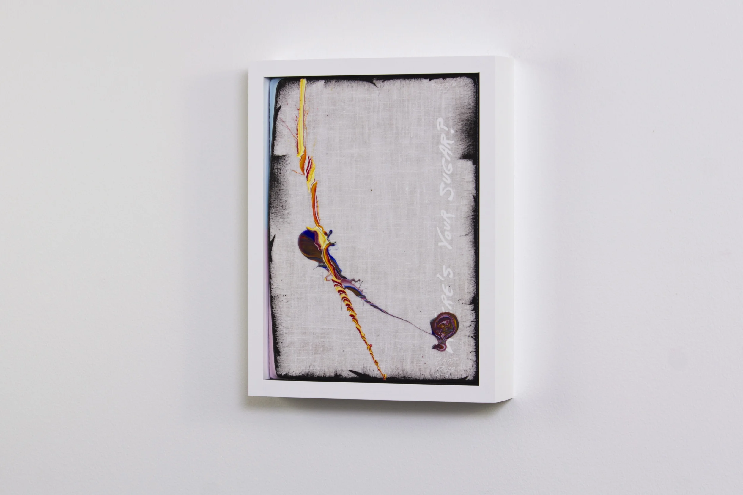 acrylic on white linen mounted on a unique handmade wood stretcher, framed