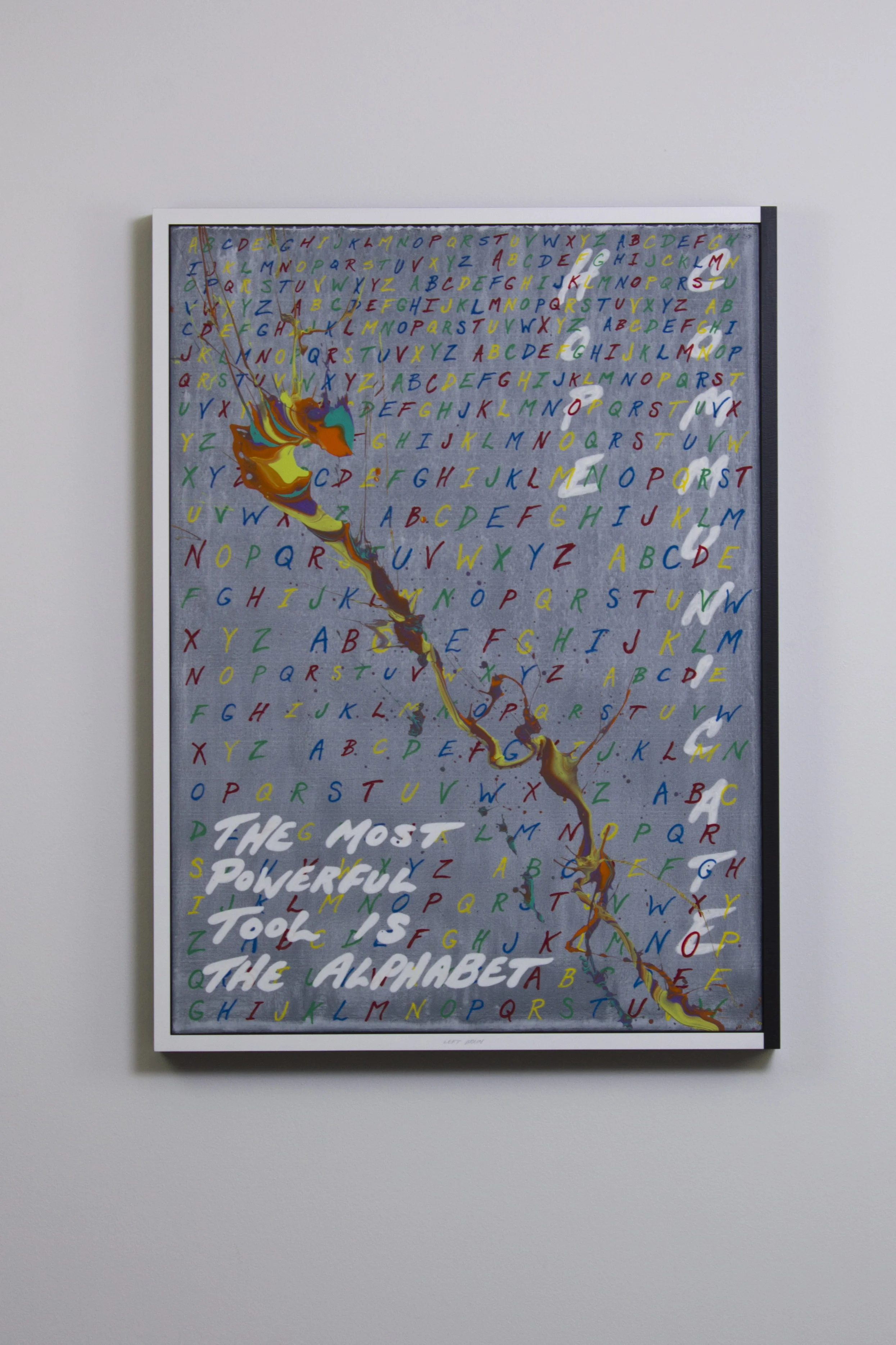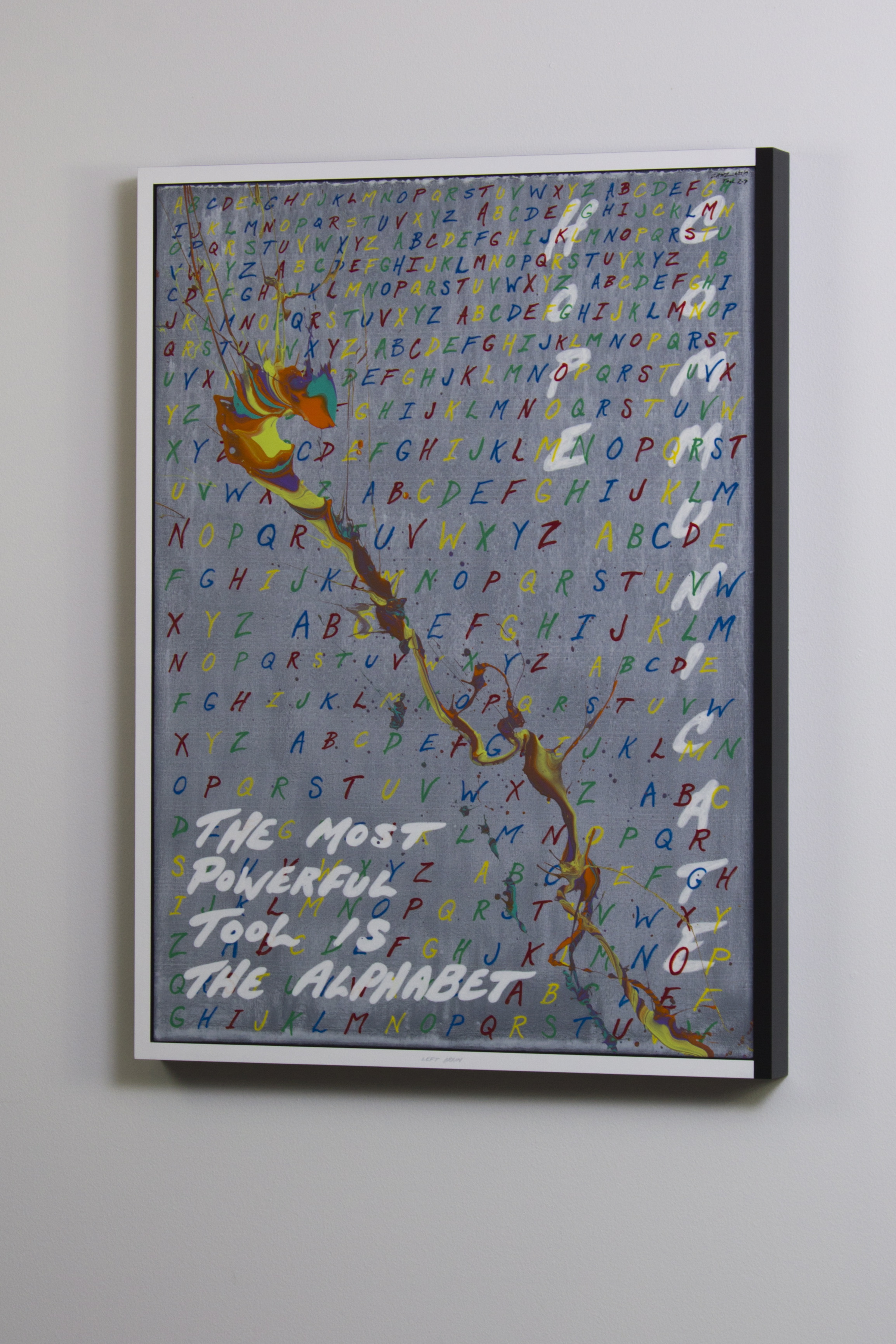 • In The Most Powerful Tool, text becomes both medium and message. Each panel proposes a different “tool”—numbers, money, the alphabet, the brain, creativity, love, hate, life, sex—and invites the viewer to debate which governs human experience most deeply.